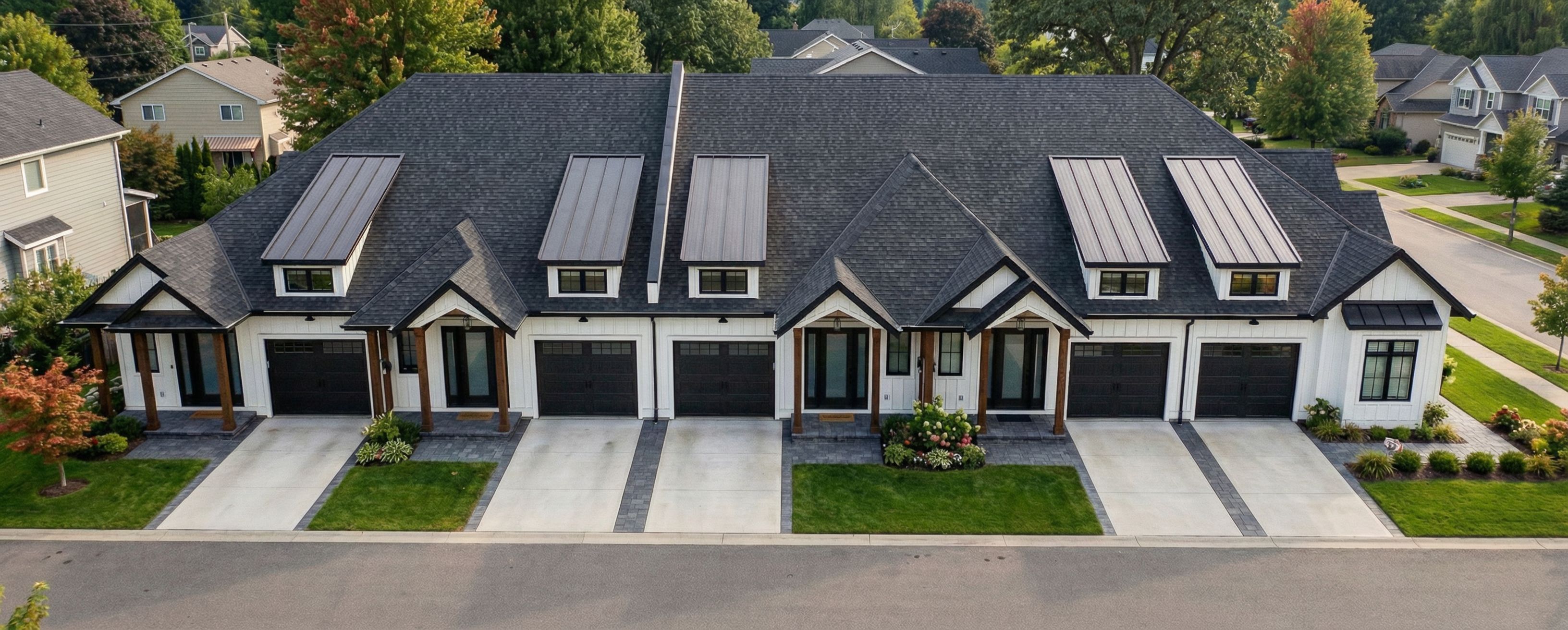 Photo of a modern duplex residential building featuring clean lines and a balanced facade. Emphasize the use of white siding contrasted with dark roofing, complemented by sleek black garage doors. The surrounding landscape includes manicured grass and a paved driveway. Natural daylight illuminates the structure, creating soft shadows that accentuate architectural details. Captured at a slightly elevated angle with a wide-angle lens, enhancing the sense of space and emphasizing the arrangement of the units., keep exact camera angle