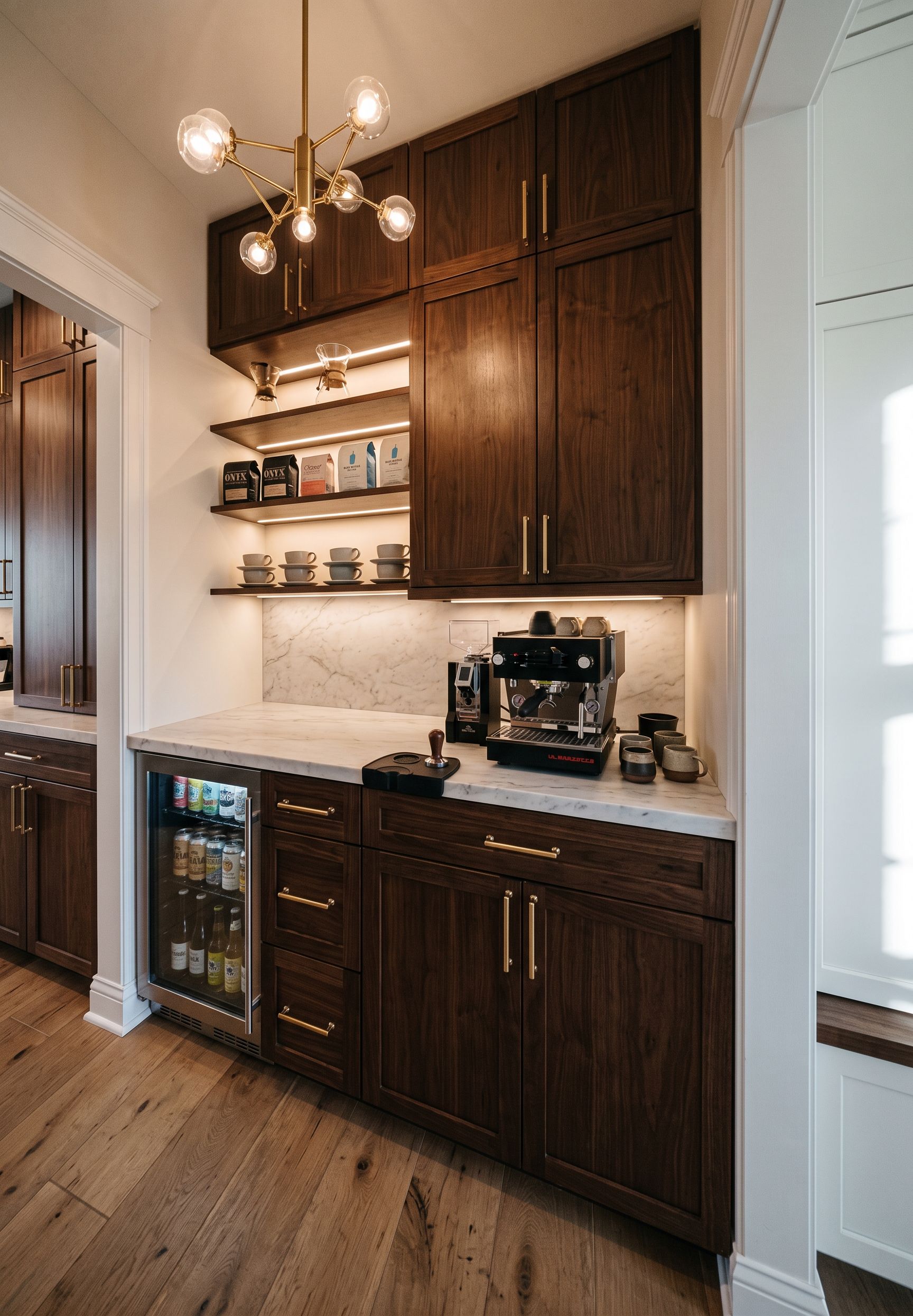 add COFFEE BAR and MODERN light FIXTURE and make this look realistic , keep exact camera angle