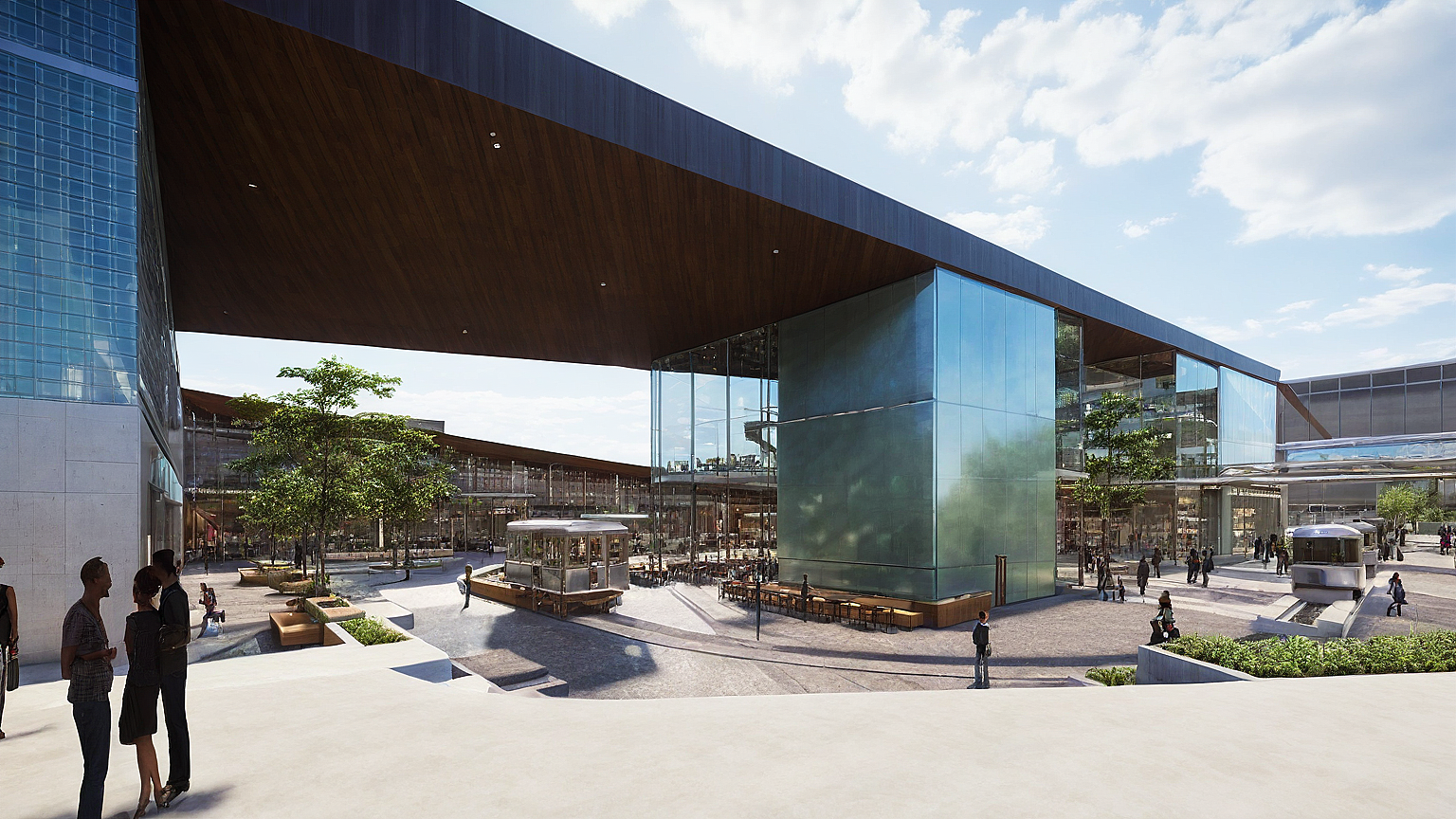 Promptdaytime social district proposal without altering the design. Turn on indoor lights for warmth. Add realistic vegetation and people where appropriate. Emphasize the materials—glass, concrete, and plaster—with accurate textures and reflections. Improve lighting, shadows, and overall atmosphere for a vivid, lively, and cohesive look. This area has cafes and restaurants. Add people sitting in the chairs. signage and the train carts are kiosks. Keep all straight lines straight.