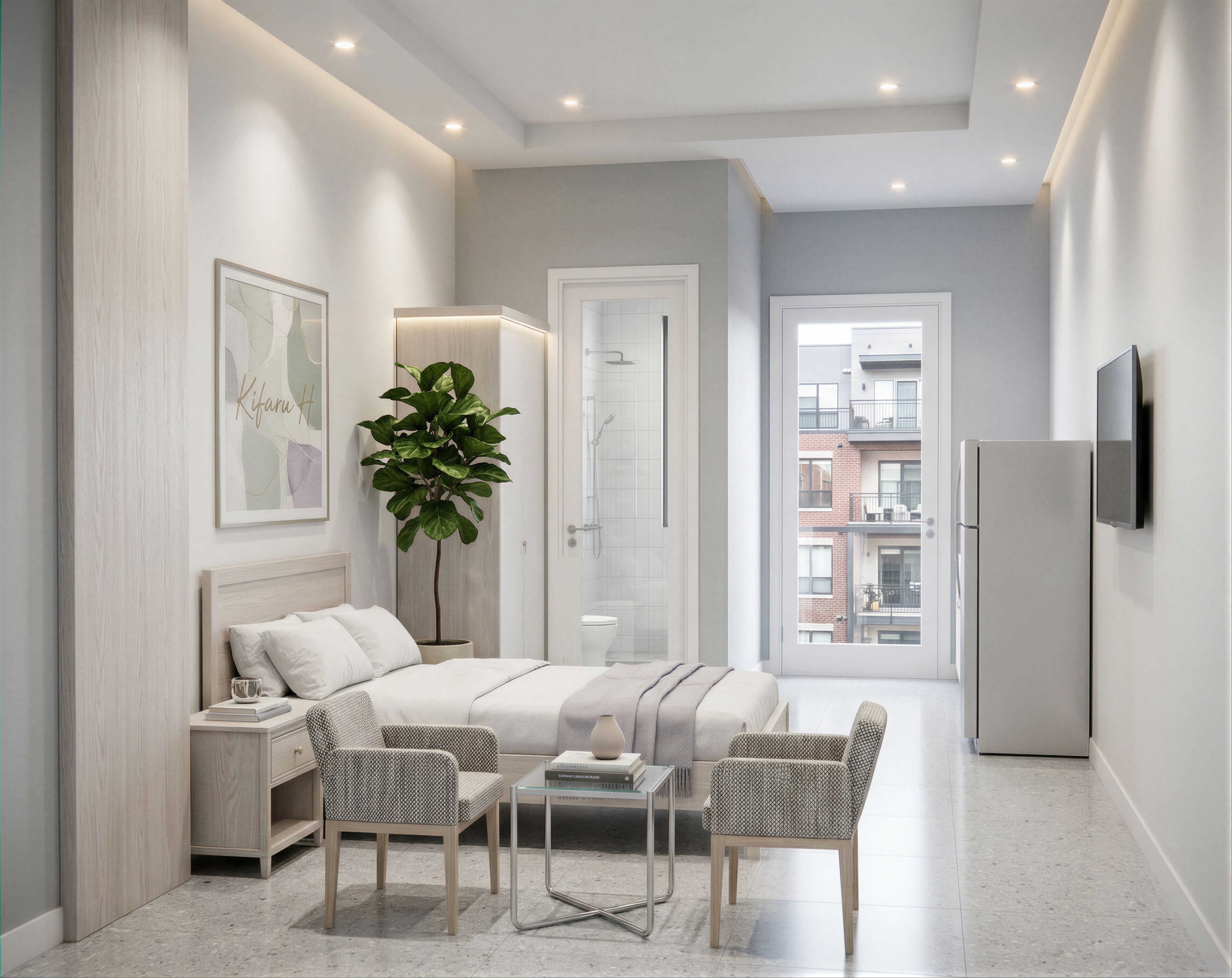 EnhancedPromptINTERIOR OF A HIGH END HOUSE SHOWING A lounge WITH WHITE AND GREY UPHOLSTERY. HAVE SIMPLE GYPSUM CEILING WITH SPOT LIGHTS. MAKE INTERIOR HIGH END PASTEL COLOUR. TURN ON THE LIGHTS IN THE ROOM. HAVE THE NAME "Kifaru H" IN ONE OF THE ART WORK ABOVE THE BED. MAKE RESOLUTION HIGH AND PHOTOREALISTIC 8K. INTRODUCE A CURTAIN IN THE WINDOW HAVE A CLEAR SLIDING DOORS BEHIND THE CURTAIN. MAKE THE WALL PAINT A MIX OF WHITE AND PASTEL GREY. MAKE THE CURTAIN RAIL IN THE BEDROOM WINDOW BE CONCEALED IN THE GYPSUM AND BE WHITE. THE IMAGE OUTDOOR THROUGH THE WINDOWS SHOULD SHOW UPPER LEVELS OF A RESIDENTIAL .APARTMENT. MAKE THE DOORS AND DOOR FRAMES WHITE AND SAME LEVEL. MAKE THE ROOM ELEGANT WITH USE OF WHITE AND PASTEL GREY ON THE WALLS. MAKE IMAGE HIGH RESOLUTION 8K. REMOVE CURTAIN AND RETURN FRIDGE AND MAINTAIN THE ONE LEAF DOOR., keep exact camera angle