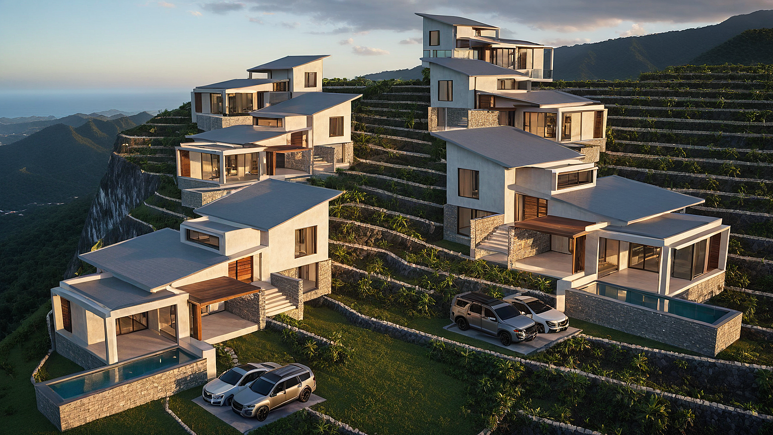 Prompttropical contemporary villa concrete stone work metal wood tropical landscape mountains backdrop sunset mood