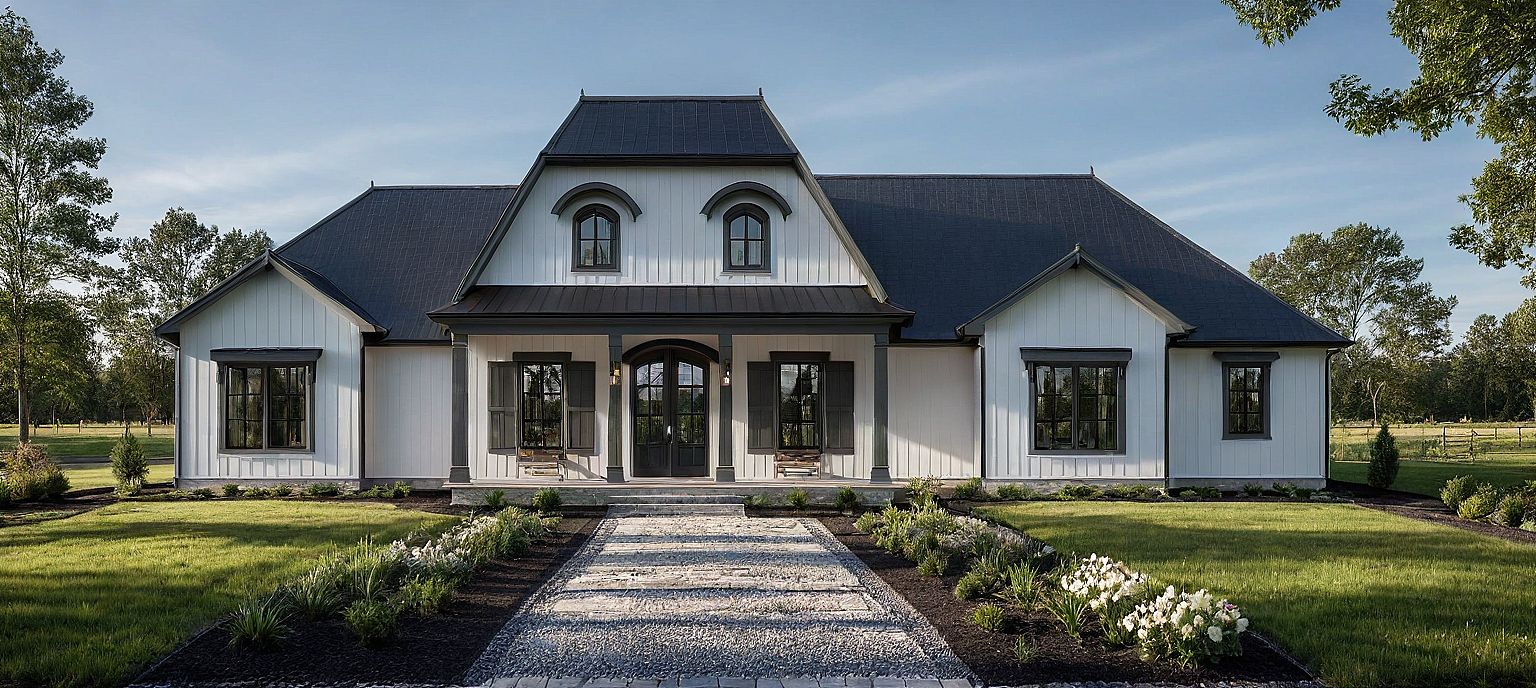 PromptA photograph of a country French farmhouse, one-story house with white horizontal and board and batten mixed siding, large, black-framed windows. Dark grey shingle roof. low mood lighting under the porch. Low mood lighting under the porch. The front yard features well-manicured green grass, vibrant flower beds, and a stone pathway leading to the entrance.