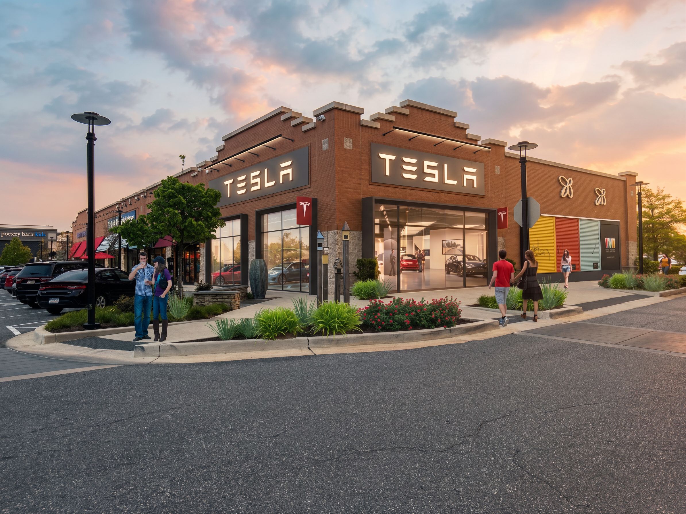 PromptPhoto of a modern retail building with a Tesla storefront, featuring brick and stone materials, large glass windows, and distinctive signage. Surrounded by a vibrant urban setting with nearby shops and landscaped greenery. Bright natural lighting during late afternoon creates dynamic shadows, highlighting architectural details. Captured from a low angle to emphasize the building's height and inviting entrance, using a wide-angle lens to include the adjacent sidewalk and pedestrians interacting in the space. Kepp camera angle as is, create soft shadows on peoples, keep exact camera angle