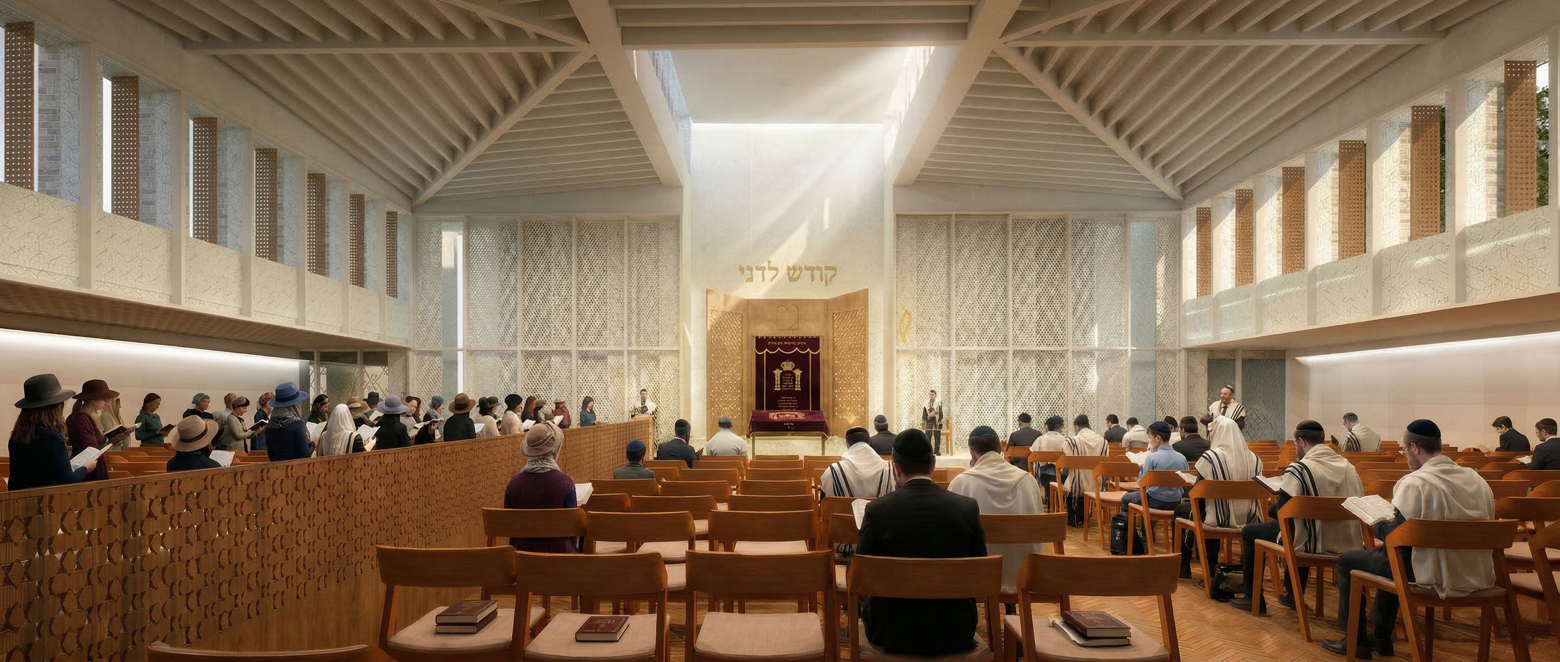 PromptThis is a modern orthodox synagogue. Keep overall daylight appearance, add more women and girls to left. no women in central part of image, but men with prayer shawl or kippa and boys, keep exact camera angle