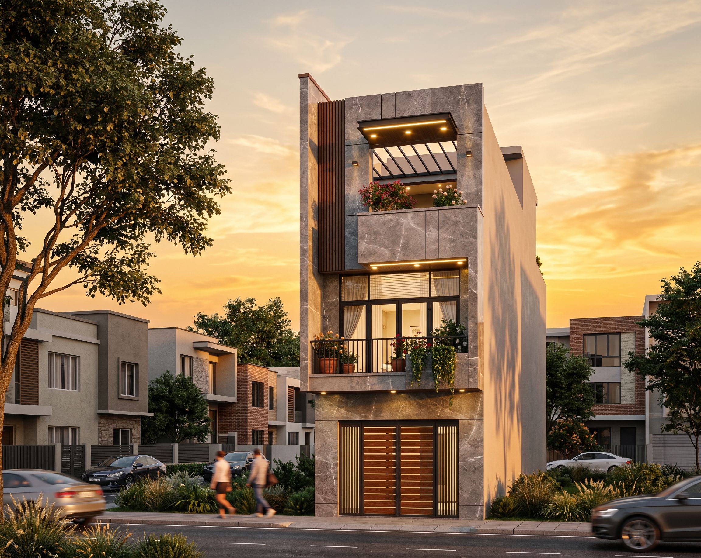 This photograph captures a modern apartment building with a sleek facade, combining natural grey stone with subtle veins and a polished surface. Dark wood railings run vertically along the left side of the building. A unique highlight is the balcony with its lightly polished black iron railing, adorned with potted plants behind it and large glass windows reflecting natural light. Long, round LED lights illuminate the balcony and awning. The building sits on an urban street, its clean lines and sharp angles harmonizing with the neighboring 2-3 story buildings. The well-lit interior highlights the double-layered sheer curtains and white blinds. The sunset creates vibrant shadows, emphasizing the texture of the materials. The overall exterior design is preserved, and the angle of the shot emphasizes the height and sophistication of the design, with the 24mm lens providing a wider view of the surroundings., keep exact camera angle