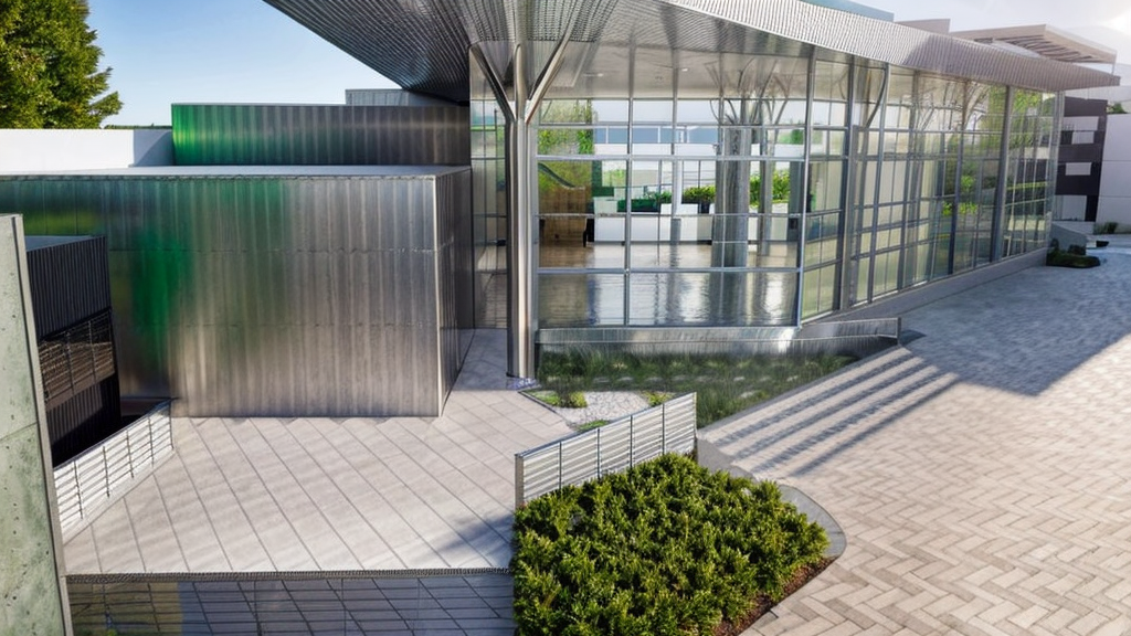 Promptmodern stainless steel building with warm light inside shine, pavement stone with landscape green