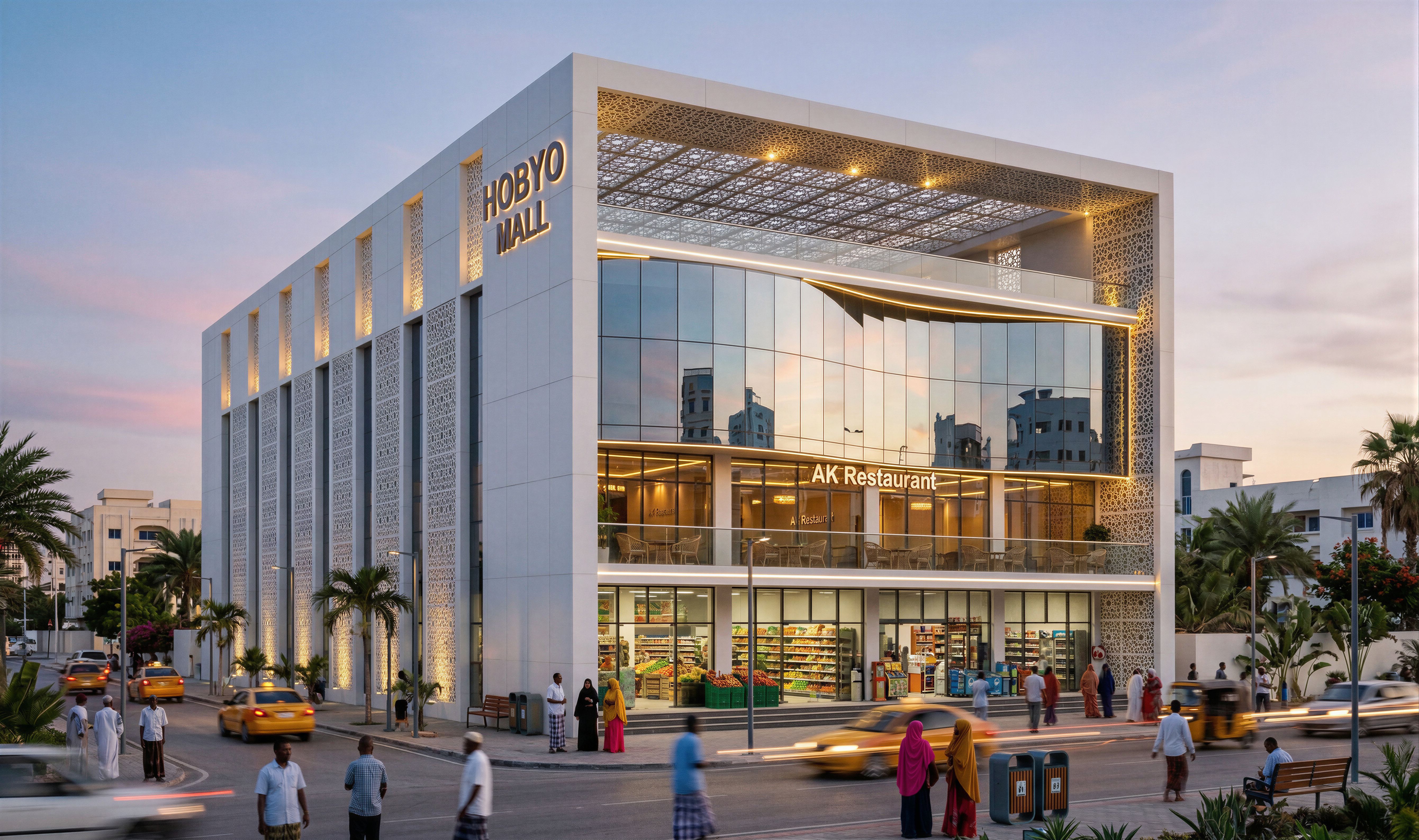 EnhancedPromptCommercial mall in Mogadishu Somalia. Make the glass realistic, transparent and reflective. Ground floor Supermarket and shops. First floor Restaurant with a balcony overlooking the road. Use white aluminium composite panels on the building . PUT PEOPLE OF SOMALI ORIGIN ON THE STREET. INCLUDE SOME SPOT LIGHTS, ROPE LIGHT AND STREET LIGHTS ON THE BUILDING. MAKE IMAGE HIGH RESOLUTION 8K. PUT NAME "HOBYO MALL" ON THE BUILDING. MAKE THE CURTAIN WALLING URVED AS IN THE ORIGINAL DESIGN AND INCLUDE RESTAURANT ON FIRST FLOOR WITH A GLASS BALCONY OVERLOOKING THE ROAD. MAINTAIN ORIGINAL DESIGN WITH THE CURVED CURTAIN WALLING ON THE FACADE. NAME RESTAURANT ON FIRST FLOOR "AK Restaurant" and make curtain walling fom a regular curve as in the original design. Put Arabic mashryabiya all round the main structure framing the buildling and on the top open part on the facade., keep exact camera angle