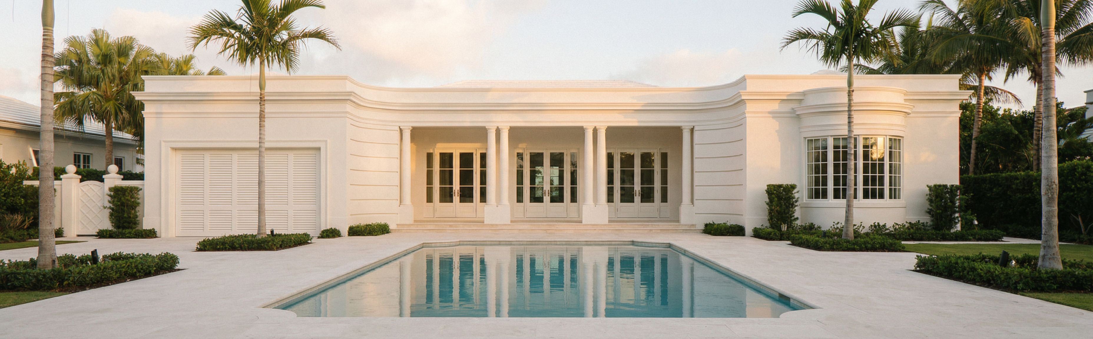 The terrace around the pool is pale limestone or light stone typical of Palm Beach estates. Landscaping is minimal and elegant with a few palm trees and low manicured hedges.