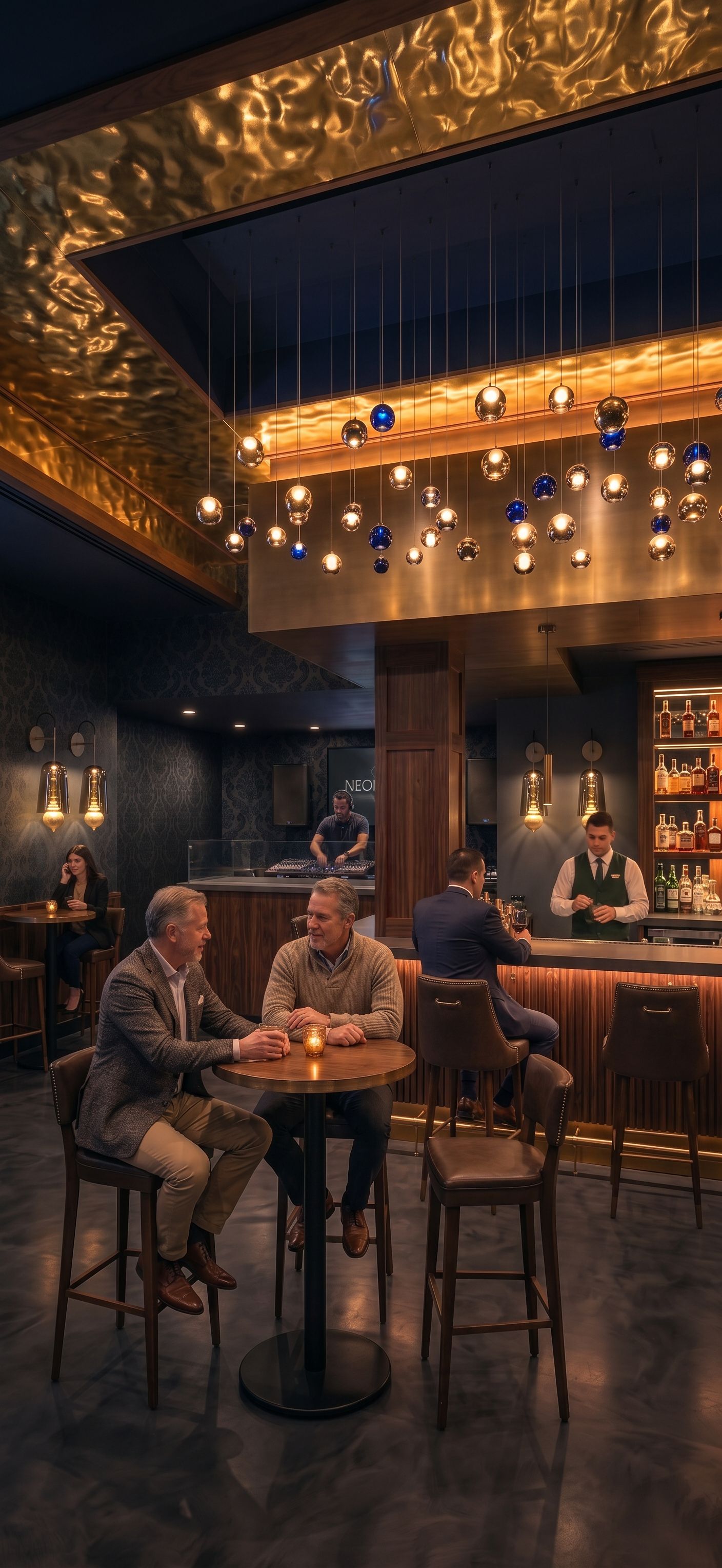 Respeta el diseño el espacio y la arquitectura general de este proyecto sin cambiar nada y añade los siguientes cambios: Añade otra mesa en el lado izquierdo con tres taburetes y 2 hombres de mediana edad, con ropa elegante pero más informal. Añade las lámparas de pared con luz cálida y tenue de la imagen de referencia1, en la pared del fondo con papel texturado negro y en la pared de la izquierda con el papel texturado negro., keep exact camera angle