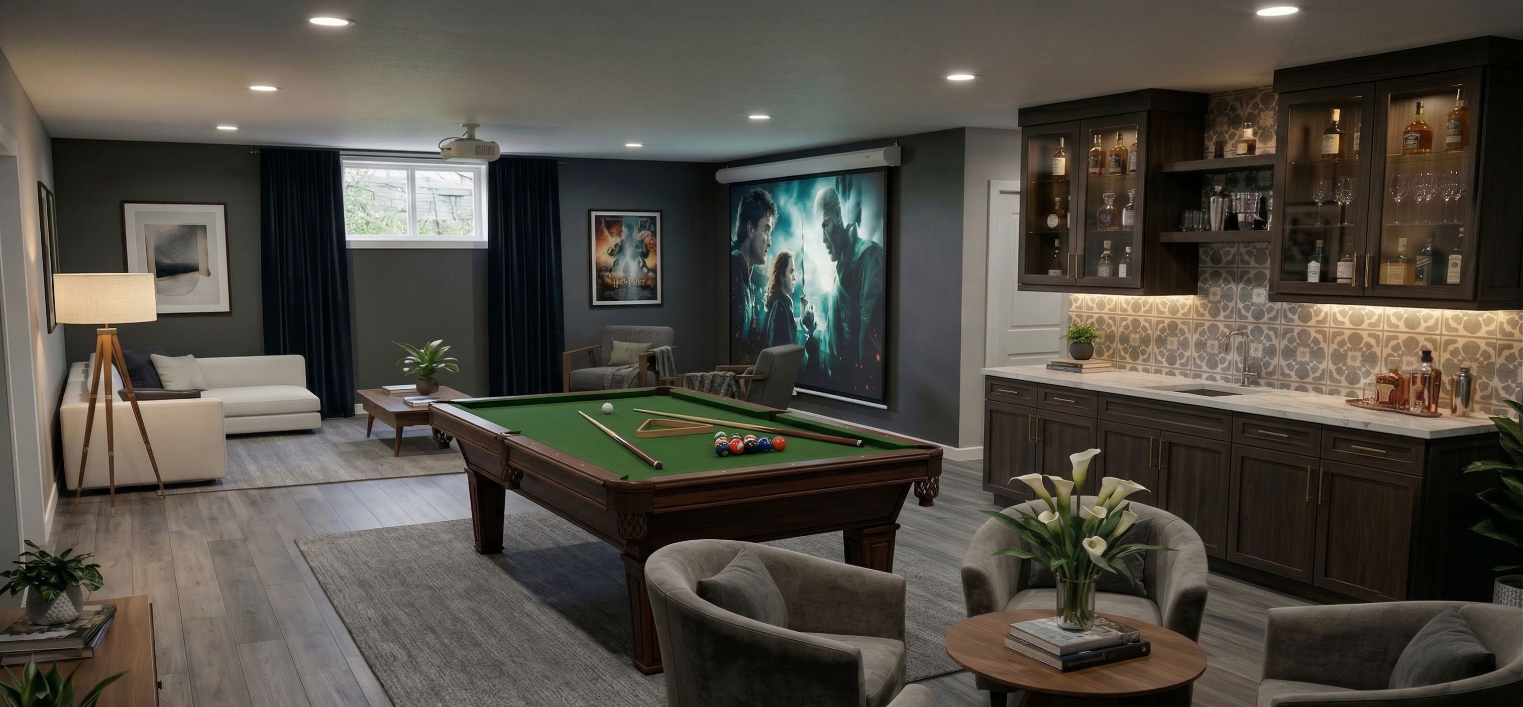 A photo of a fun basement rec room, a moody theatre area, projector and screen, cozy furniture, a table and chair set, custom bar area with booze on display, glass door upper cabinets, wine glasses, marble counters, fun back splash, dark wood cabinets, grey wood flooring, curtains and art work on either side of the window, pot lights in the ceiling, under cabinet lights, keep exact camera angle, keep exact camera angle