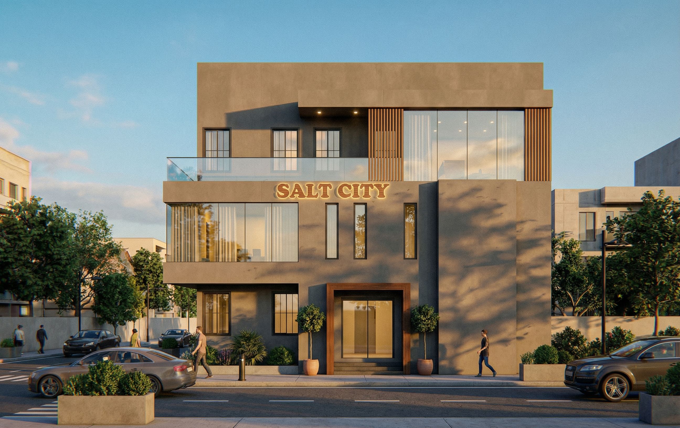 PromptPhoto of a modern commercial building with a prominent sign reading "SALT CITY." The facade features clean lines, large glass panels, and a combination of textures, including smooth concrete and wooden accents. Surrounded by an urban setting with nearby shops and streets. The scene is bathed in warm afternoon light, casting soft shadows on the surface. Captured from a straight-on perspective, using a wide-angle lens to emphasize the building's height and details, showcasing its contemporary design and inviting commercial atmosphere., keep exact camera angle