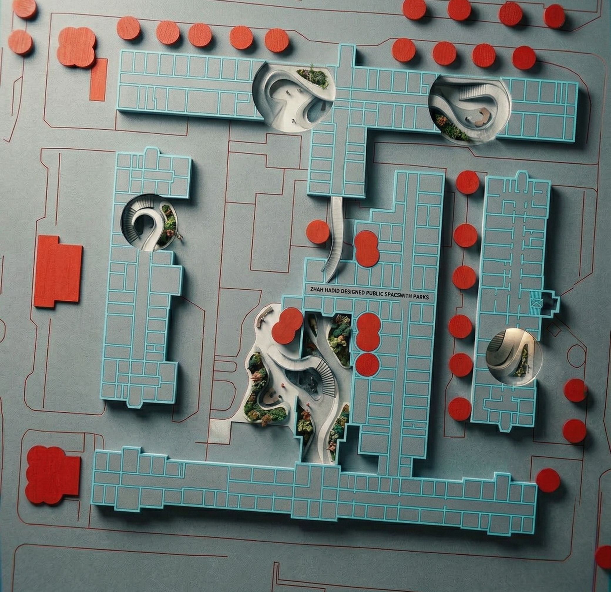 PromptEdit this floor plan. Edit "only and exclusively" the areas of the floor plan under the magenta circles, creating open spaces with vertical connections and public spaces with Zaha Hadid-style planting. The spatial design must adapt to the shape of the cyan floor plan., keep exact camera angle