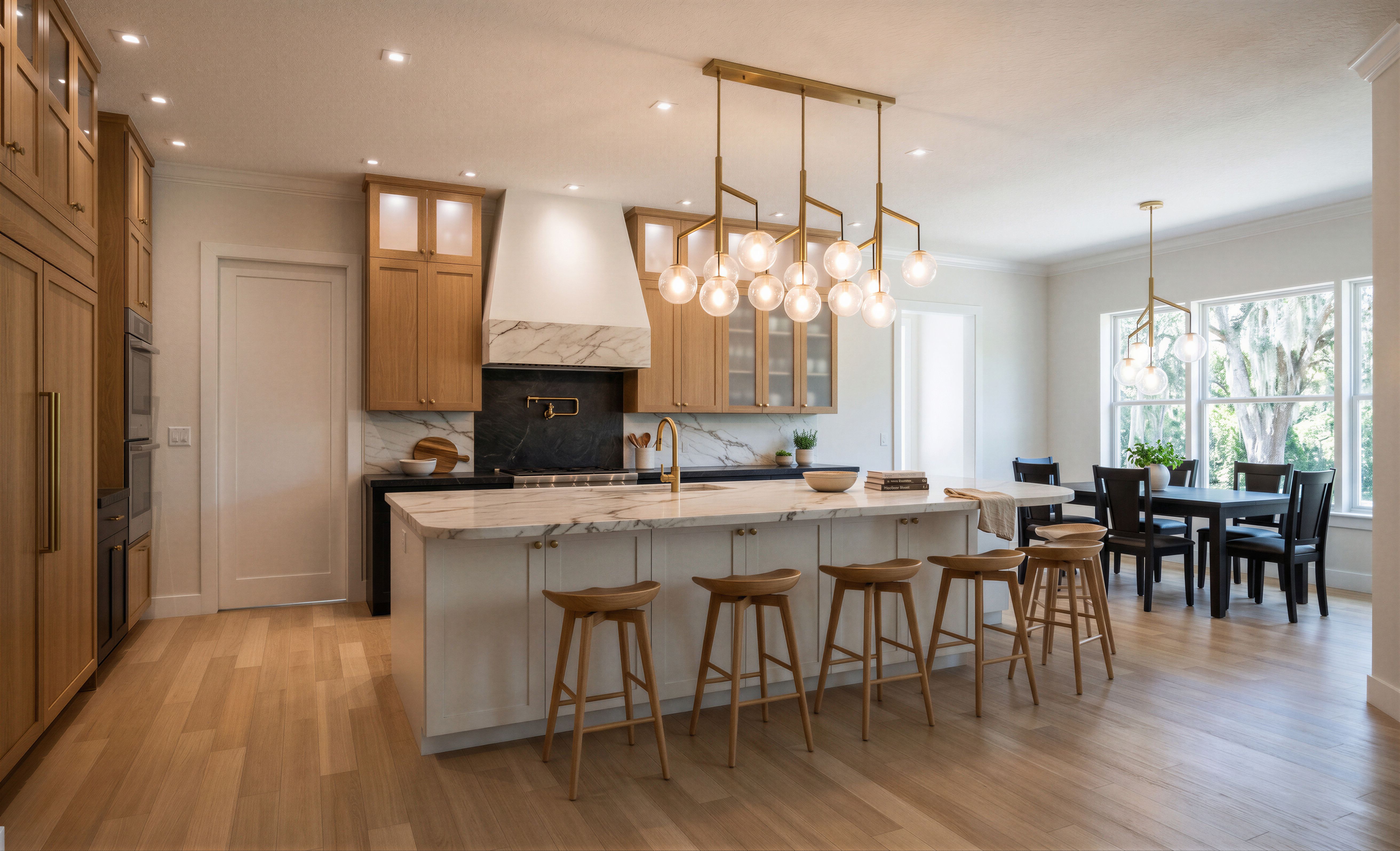 Make photorealistic rendering of this kitchen; Light fixtures are on, bright room; Add deciduous trees through the Nook windows, trees are as from Florida; Do not open door, which are not opened; Glass on cabinet doors only where shown in the image, glass is opaque glass; Do not add cabinets which are not there; Do not add chairs and table which are not there; Keep exact camera angle, keep exact camera angle