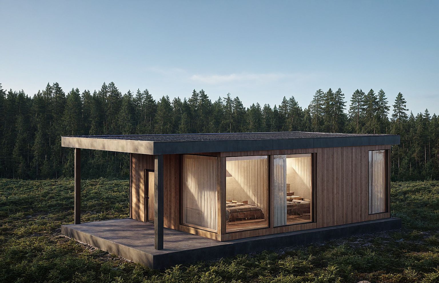 PromptDetailed picture of a house in the forest. Replace the background with a pine forest. Keep all the details of the house, do not add new ones.