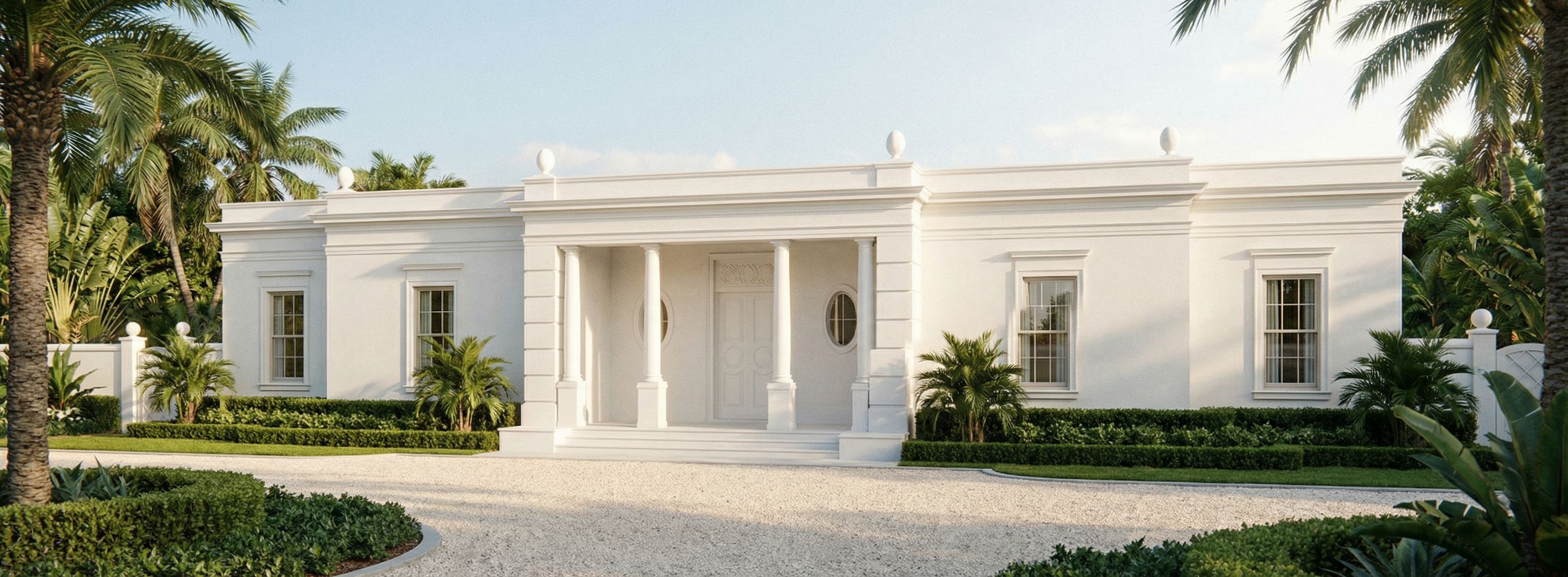 PromptUltra-photorealistic rendering of a Neo-Classical Regency Palm Beach residence using the provided elevation as a fixed, non-editable architectural blueprint. CRITICAL — ABSOLUTE CONSTRAINTS: Do not add, remove, or reinterpret any architectural elements. Do not add an additional entablature, parapet height, attic story, or upper level. The building is strictly one story with a single continuous entablature line across the entire façade. Do not thicken, stack, or duplicate the entablature. Do not raise the central mass above the rest of the building beyond what is shown in the elevation. MASSING MUST MATCH EXACTLY: The façade must clearly read as three stepped depth planes: Central entry pavilion projects forward Flanking wings are recessed End wings are recessed further Do not align into one flat plane and do not compress or exaggerate these offsets. Preserve all proportions, symmetry, window and door placement, column spacing, and horizontal datum lines exactly. Single-story Neo-Classical Regency composition with a projecting central entry pavilion. Classical columns support a single entablature. Oval finials on roof in essential points that are in proportions with the rest of the house. DOOR + TRANSOM (VERY IMPORTANT): Above the front door is a transom panel within the door opening, not part of the roof or parapet. This panel is solid (no glass) and contains refined Regency plaster relief (low relief, elegant, symmetrical). Materials: all-white palette. smooth stucco, slightly brighter white trim, crisp classical detailing. Thin mullions, soft reflective glass, minimal bronze accents. Palm Beach landscape: symmetrical, restrained, luxurious. Curved motor court Lighting: soft warm 3PM sunlight illuminating the front façade directly. Gentle shadows that reveal the step-backs and column depth. Camera: slightly offset 3/4 front view (not straight elevation), eye-level, 35mm lens. Ensure visible depth between the three façade planes. Highly realistic materials, subtle imperfections, soft reflections. NEGATIVE CONSTRAINTS: no second story, no attic, no added parapet height, no stacked entablature, no roof ornament, no misplaced relief, no modern reinterpretation, no altered proportions, no flattened façade, keep exact camera angle