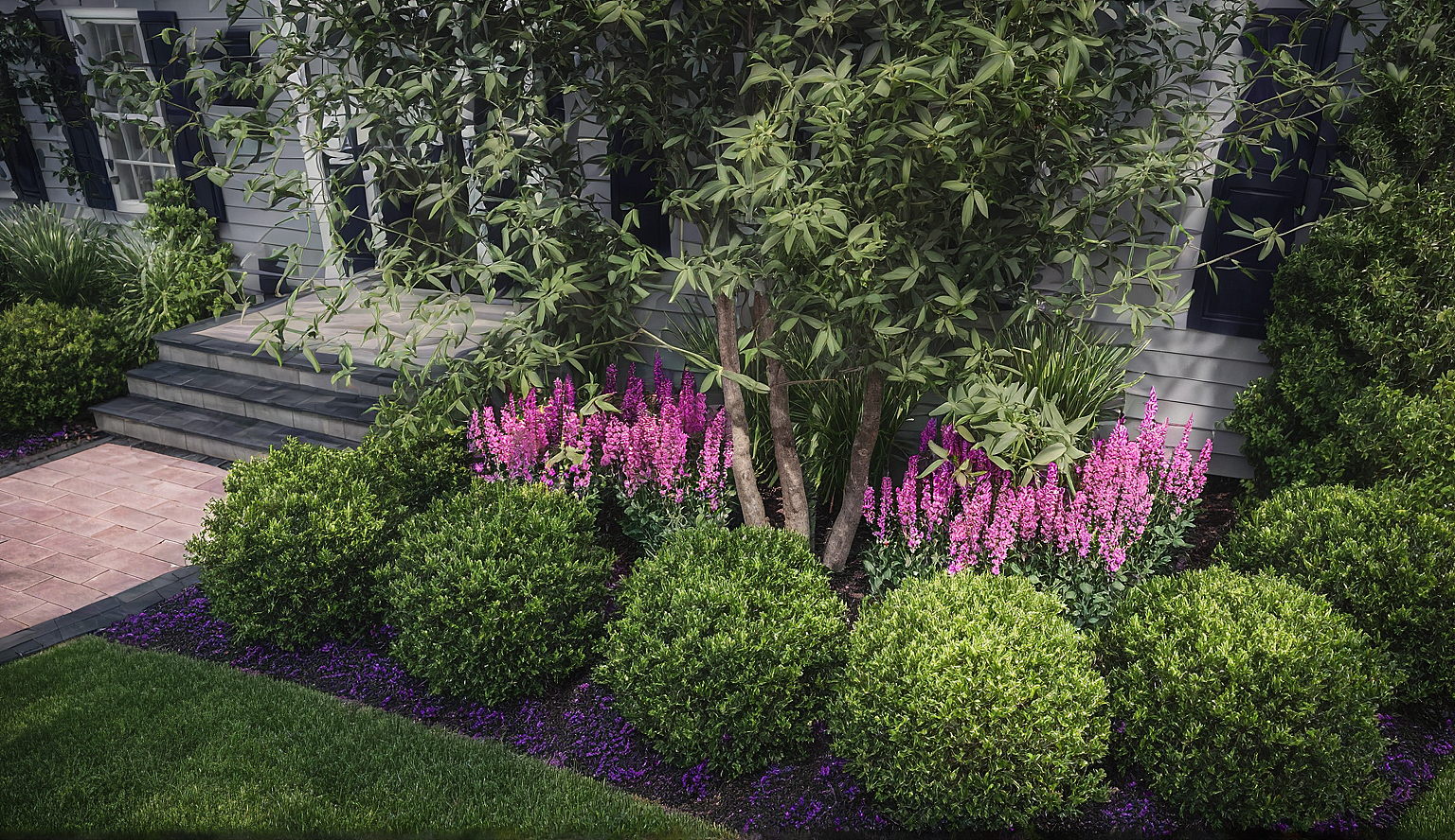 PromptNavy house, paver walkway, boxwoods, black shutters, pink salvia plants