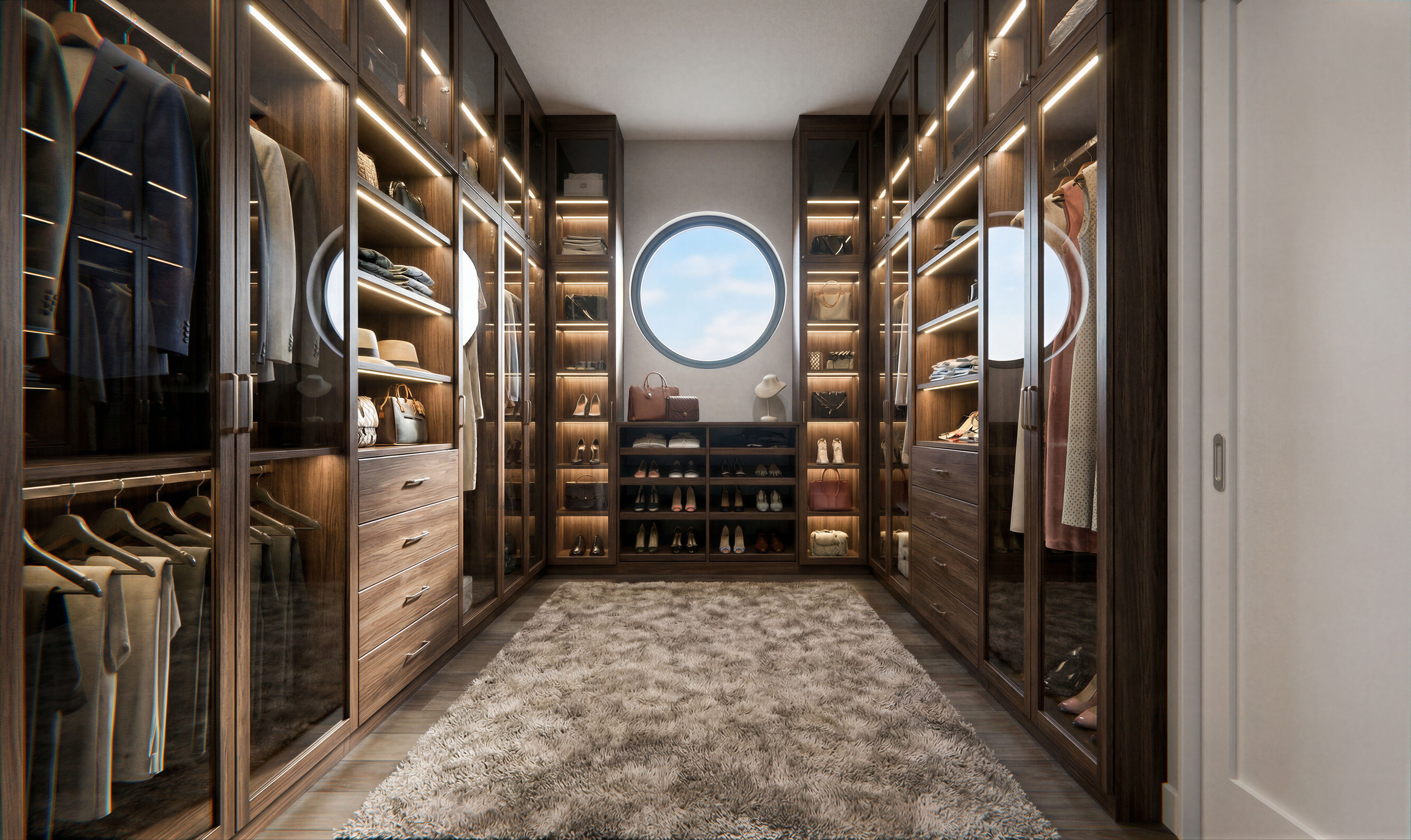 EnhancedPromptroom is 7 feet 6 inches wide, 18 feet long, 10 feet high, window is 3 feet 6 inches diameter, window top is at 8 feet, make luxury Master WIC with built-ins on both sides, left and right walls only, built-ins 24 inches deep, no built-ins against window wall, front face of built-ins tight to edge of window, mixture of his and hers items, other misc. items where appropriate, no island, no cross in round window, sky view through the window, do not stretch the image, keep the exact angle, keep exact camera angle