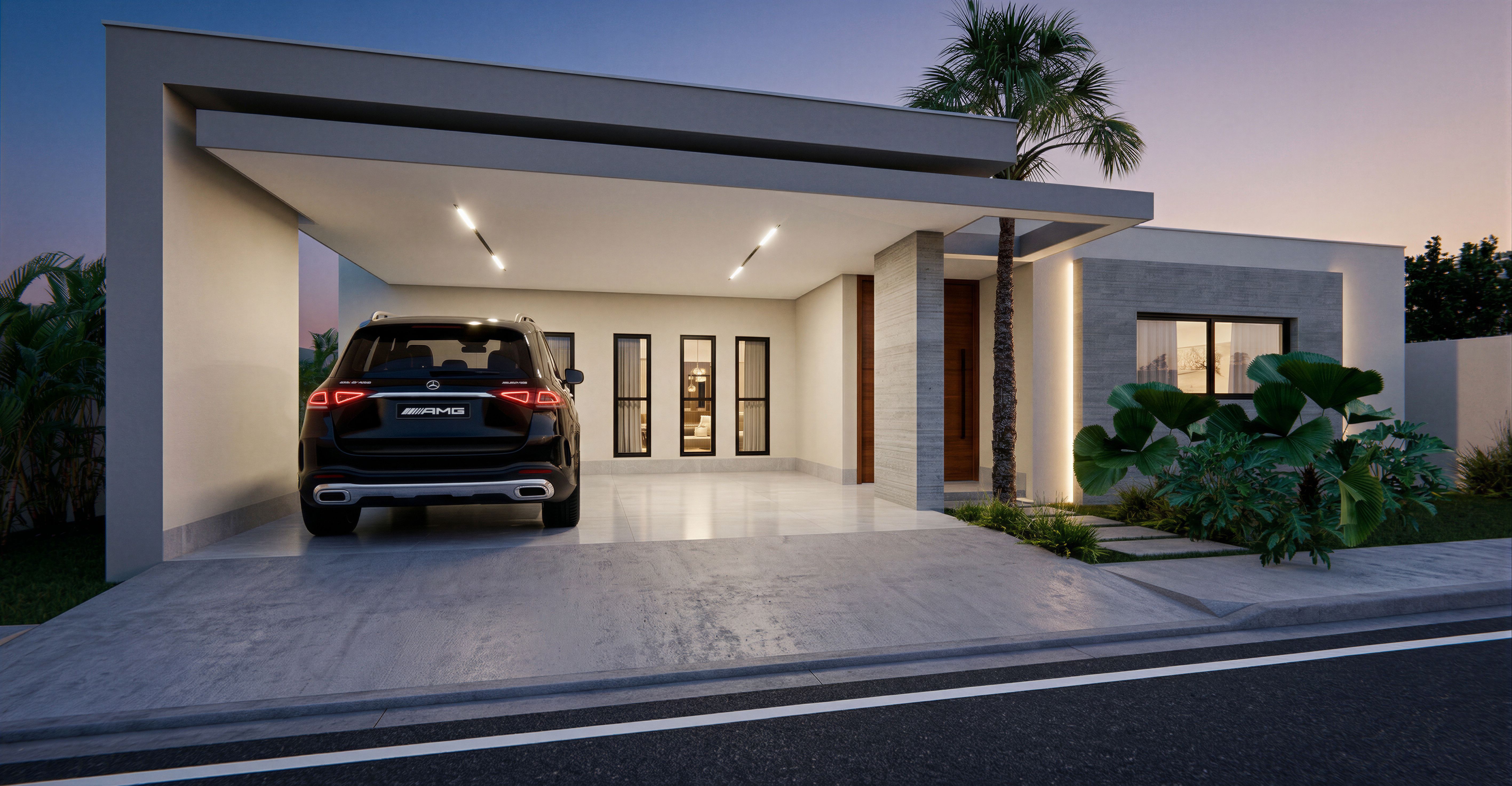 well-smoothed walls. well-smoothed ceiling. the walls color is off white. The column and the gray front wall are made of exposed concrete with stripes. the floor tiles are light grey porcelain. The ramp is made of concrete, just like the pedestrian sidewalk. gardening true to my design. Indirect light behind the exposed cement wall. the lower ceiling of the garage is entirely white. The vehicle inside the garage is a black 2025 Mercedes Benz GLE 450 AMG. Do not add flashing to walls or ceilings at the top. Do not add a handle to the wooden front door., keep exact camera angle