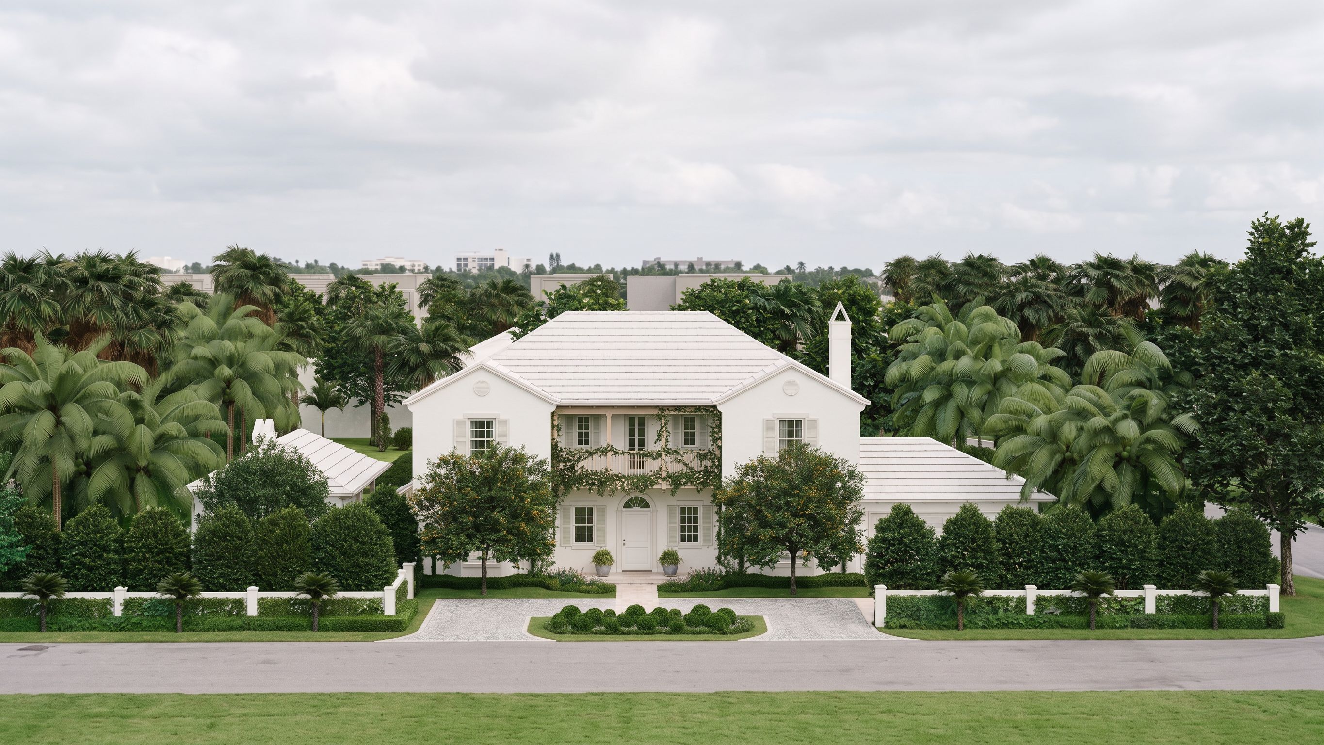 Create an ultra-photorealistic architectural rendering using the provided image. IMPORTANT: Preserve the original architecture, landscape layout, and hardscape design intent. Enhance realism without redesigning or altering the composition. FOCUS: - House - Immediate landscaping - Hardscape - Street edge HARDSCAPE KEEP PATTERN + IMPROVE REALISM: - Darker hardscape: light grey tabby concrete • Maintain existing layout and pattern • Add subtle aggregate texture and tonal variation • Slight natural wear for realism - Lighter hardscape: Dominican coral stone • Maintain existing pattern and geometry • Warm off-white / pale coral tone • Subtle porous texture with soft variation LANDSCAPE: - Keep planting design and placement consistent - Enhance realism through: • Natural variation in greens • Slight irregularity in trimming • Better depth and shadow between plants MATERIALS: - Smooth white stucco BM White Dove with soft tonal variation - White aluminum window frames with subtle reflectivity - Roof: white concrete tile with visible depth - Wood: lime-washed cypress, light with minimal grain - Maintain distinction between cast stone and limestone LIGHTING: - Soft diffused daylight - Even illumination across façade - No harsh shadows or blown highlights BACKGROUND: - Keep background minimal and secondary - Soft trees and distant context only - Avoid detailed or repetitive houses CAMERA: - Straight-on elevation with slight perspective - Natural lens 50–70mm STYLE: - Ultra-realistic - High-end Palm Beach residential - Clean, refined, atmospheric, keep exact camera angle