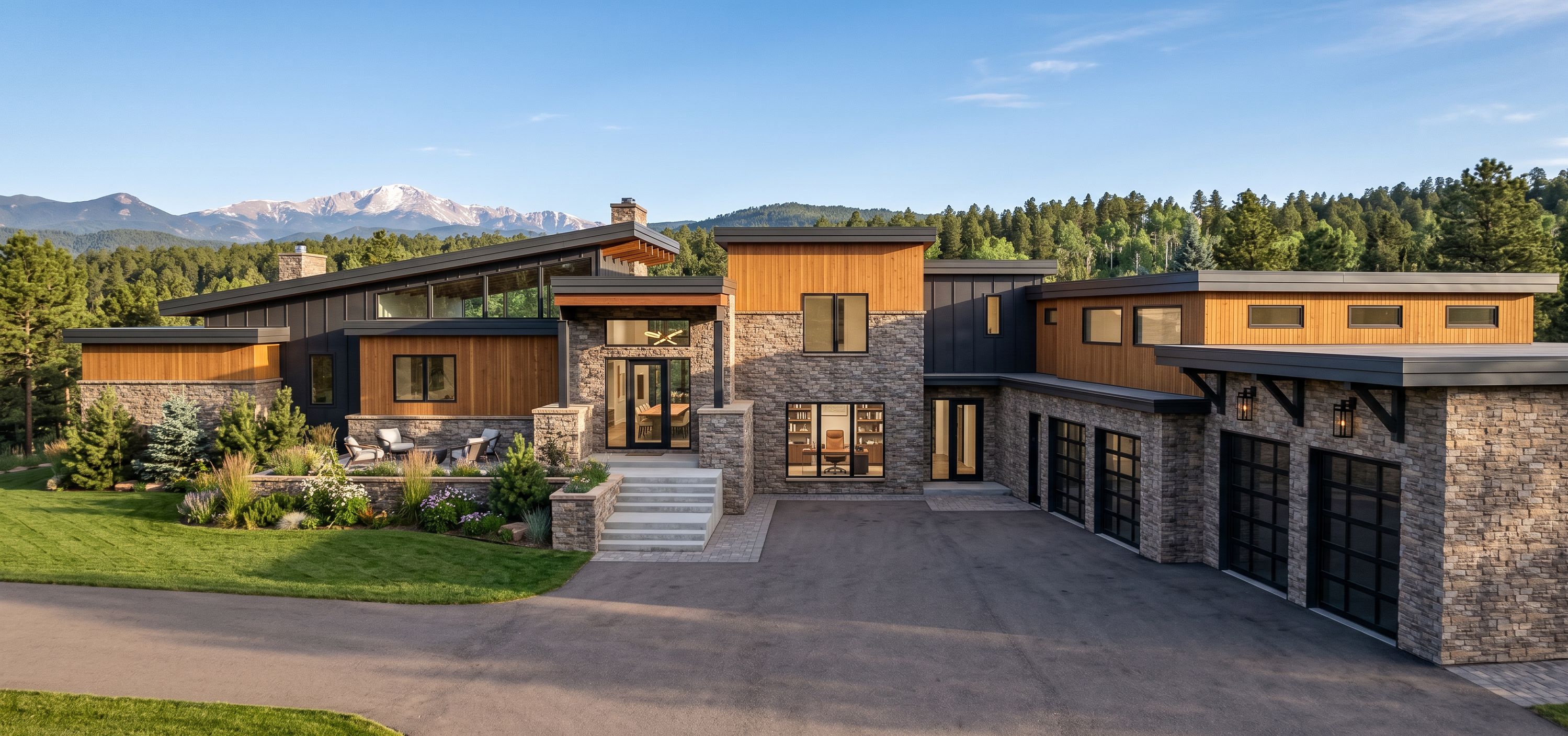 The project is located at 520 Sunny Glen Court in Woodland Park, Colorado. it will be on a hillside looking down the hill with forest far in the back. There will be no basement. Design the home using a balanced blend of natural and modern materials, including Natural stone where stone is shown. Warm stained wood siding and soffits where wood is shown. Dark metal panel where metal is shown along with the fascia's. Overall style should feel like a high-end Colorado mountain modern home— with clean and minimal landscaping keep exact camera angle. There will be a view of the north side of pikes peak in the background on the middle-left. Keep the driveway to the extent that it is shown do not add anything more. Through the front door will be the dining room. The 3 large ground floor windows to the right of the entrance will be a study. The stone walls around the columns and front patio are planters which will have plants and flowers in them. , keep exact camera angle