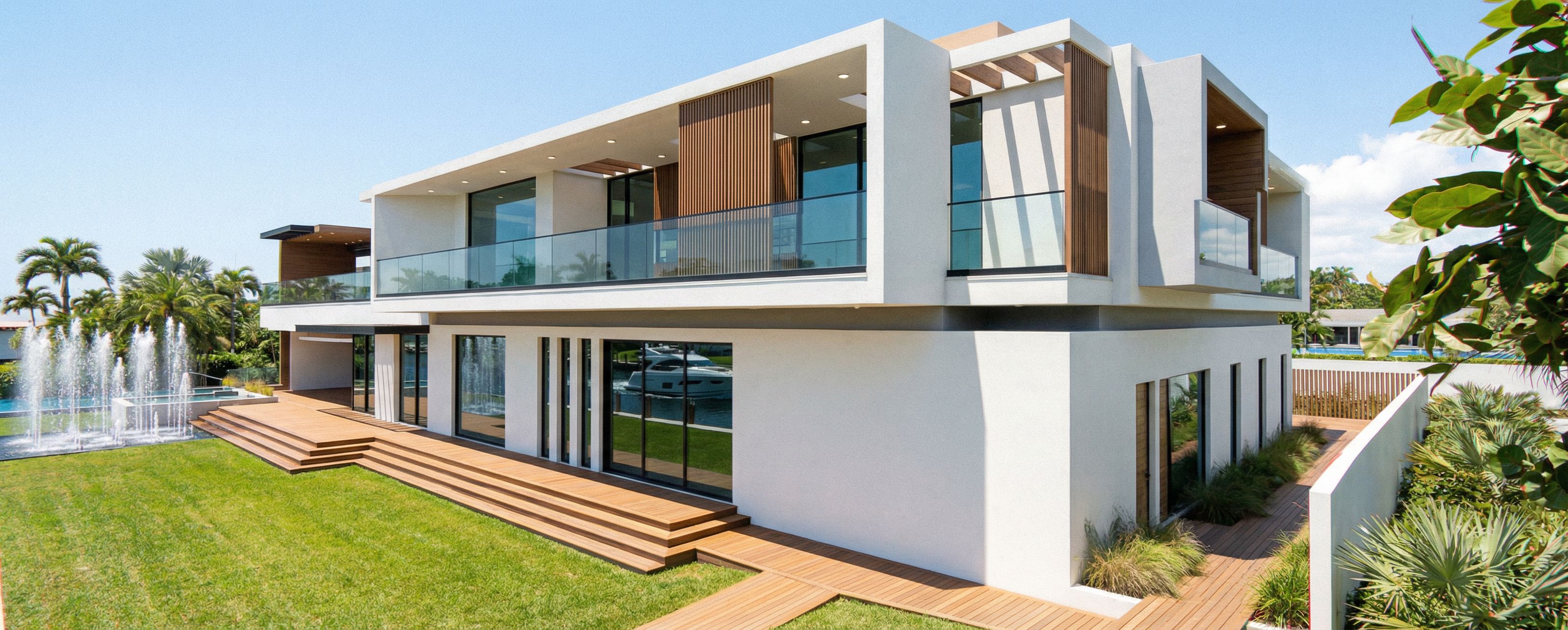 PromptRENDER HYPER REALISTA. CASA MODERNA. VEGETACION TIPICA DE LA FLORIDA. TODOS LOS VIDRIOS LOW E CLEAR. LOS PISOS DE MADERA EN TONO DECK COMO EL DE LOS YATES. COLOCAR MINI LEDS REDONDOS EN LOS TECHOS EXTERIORES MENOS EN LAS PERGOLAS. EN LOS REFLEJOS DE LA VENTANAS DEL PRIMER PISO MOSTRAR UN YATE PASANDO Y UN CANAL, NO MOSTRAR PALMERAS NI ARBOLES EN LOS VIDRIOS DE LOS BALCONES DEL SEGUNDO PISO. MOSTRAR LOS CHORROS., keep exact camera angle