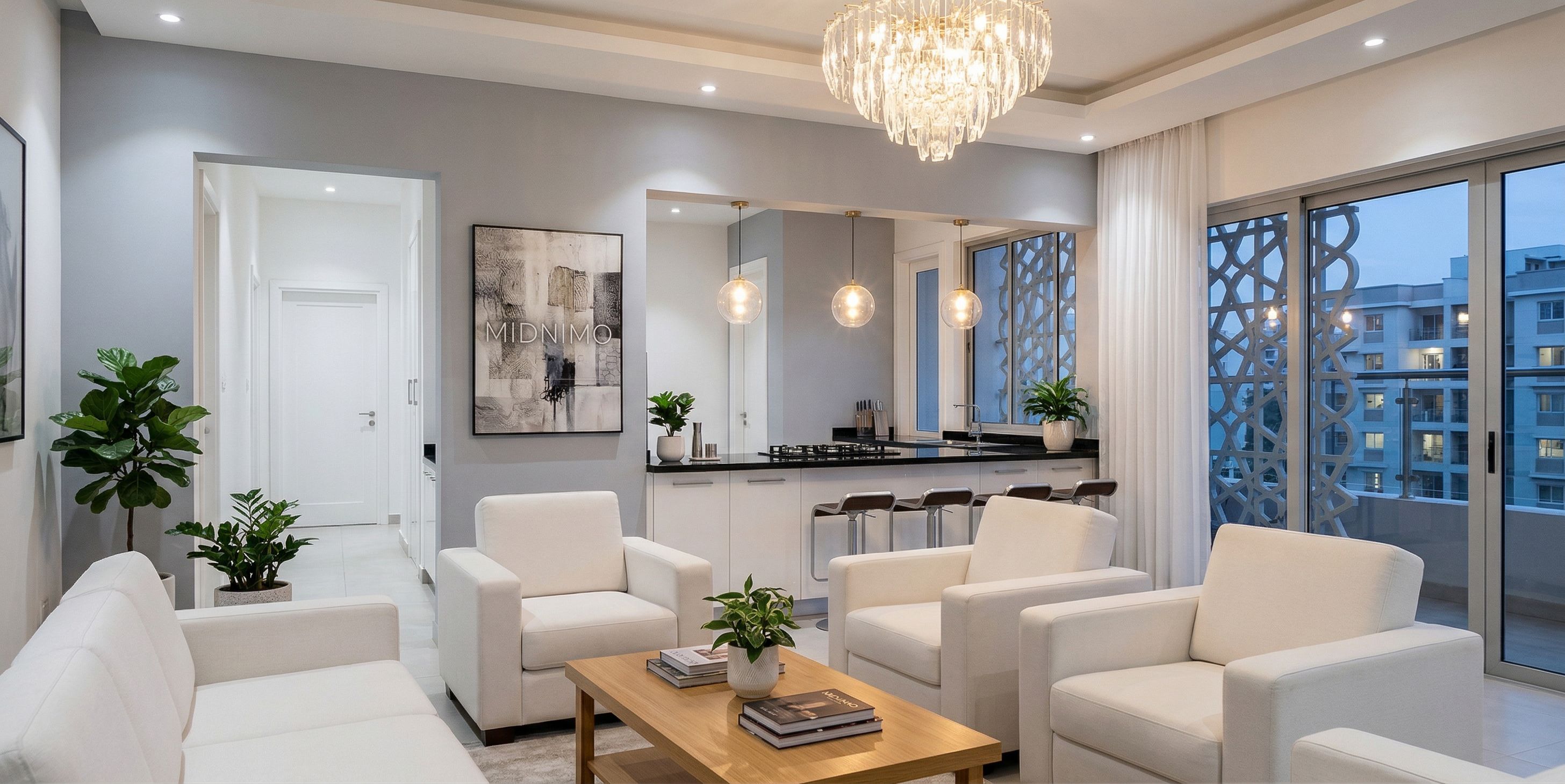 INTERIOR OF A HIGH END HOUSE VIEWED FROM THE LOUNGE SHOWING THREE SUSPENDED LIGHTS ACROSS THE SERVICE HATCH FROM THE KITCHEN . HAVE SIMPLE GYPSUM CEILING WITH SPOT LIGHTS. HAVE SOME WALL BRACKETS ON THE WALL. MAKE INTERIOR HIGH END PASTEL COLOUR. TURN ON THE LIGHTS IN THE ROOM. HAVE BRILLIANT WHITE CABINETS IN THE KITCHEN AGAINST A BLACK GRANITE TOP IN THE KITCHEN. HAVE THE NAME MIDNIMO IN ONE OF THE ART WORKS. MAKE RESOLUTION HIGH AND PHOTOREALISTIC 8K. INTRODUCE A CURTAIN IN THE SITTING ROOM WINDOW HAVE A CLEAR SLIDING DOORS BEHIND THE CURTAIN. INTRODUCE AN INBUILT COOKER IN THE MIDDLE SPACE LEFT IN THE LOWER CABINETS. MAKE THE WALL PAINT A MIX OF WHITE AND PASTEL GREY. MAKE THE CURTAIN RAIL IN THE SITTING ROOM BE CONCEALED IN THE GYPSUM AND BE WHITE. HAVE THE SUSPENDED LIGHTS IN THE BREAKFAST AREA BE OF CLEAR ROUND BALLS AND HAVE WARM LIGHTS. INTRODUCE A CHANDELIER MADE OF GLASS WITH WARM LIGHT IN THE SITTING ROOM AREA. THE IMAGE OUTDOOR THROUGH THE WINDOWS SHOULD SHOW UPPER LEVELS OF A RESIDENTIAL .APARTMENT. INTRODUCE IN BUILT COOKER IN THE LOWER CABINET IN THE MIDDLE REMAINING SPACE. MAKE THE DOORS AND DOOR FRAMES WHITE. MAKE THE LATTICE WORK THROUGH THE WINDOW BE LIGHT GREY AND INTRODUCE A FRAMING ON THE EDGE. MAKE THE COUCHES WHITE, COMFORTABLE AND AND CONTEMPORARY IN DESIGN. INTRODUCE AN INBUILT COOKER IN THE REMAINING MIDDLE SPACE IN THE LOWER CABINET AT THE SERVICE AREA. INTRODUCE A VERTICAL FRAMING TO THE LATTICE WORK VISIBLE THROUGH THE WINDOW., keep exact camera angle