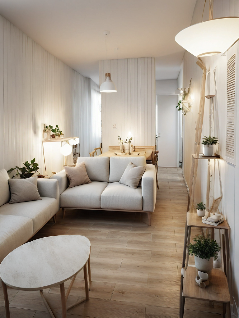 Promptdetalla foto de una sala comedor con muros blancos y decoracion en general de estilo nordico en una escena de dia