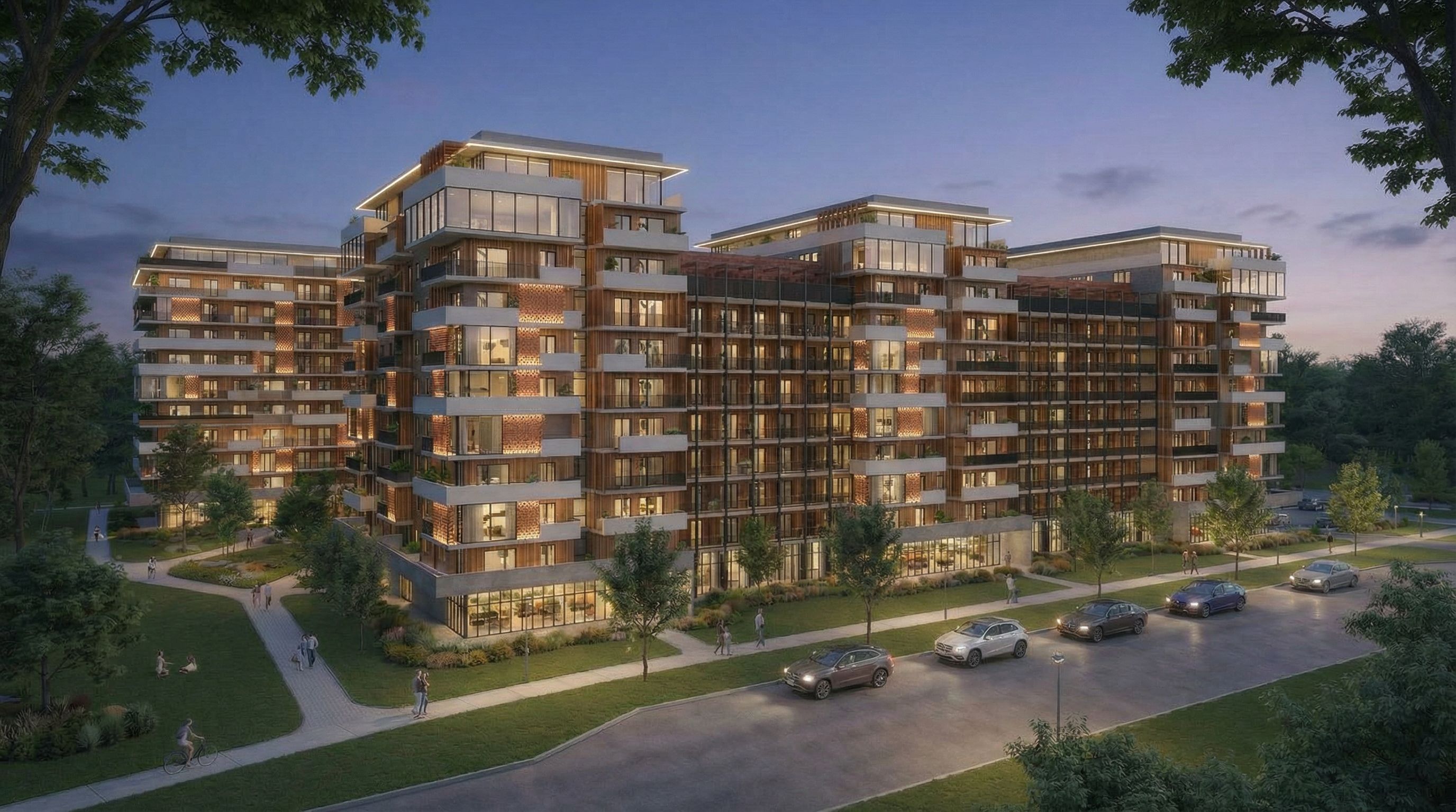 architectural exterior rendering, render this photo into photorealistic rendering, make all the walls wich now are capuccino, in fluted panels from wood. keep the brickwalls wich are at the balconies. pu lights behind the brick walls, and ld stripes at the upper level, keep exact camera angle, dusk atmosphere with soft lighting, high quality, professional, detailed scene