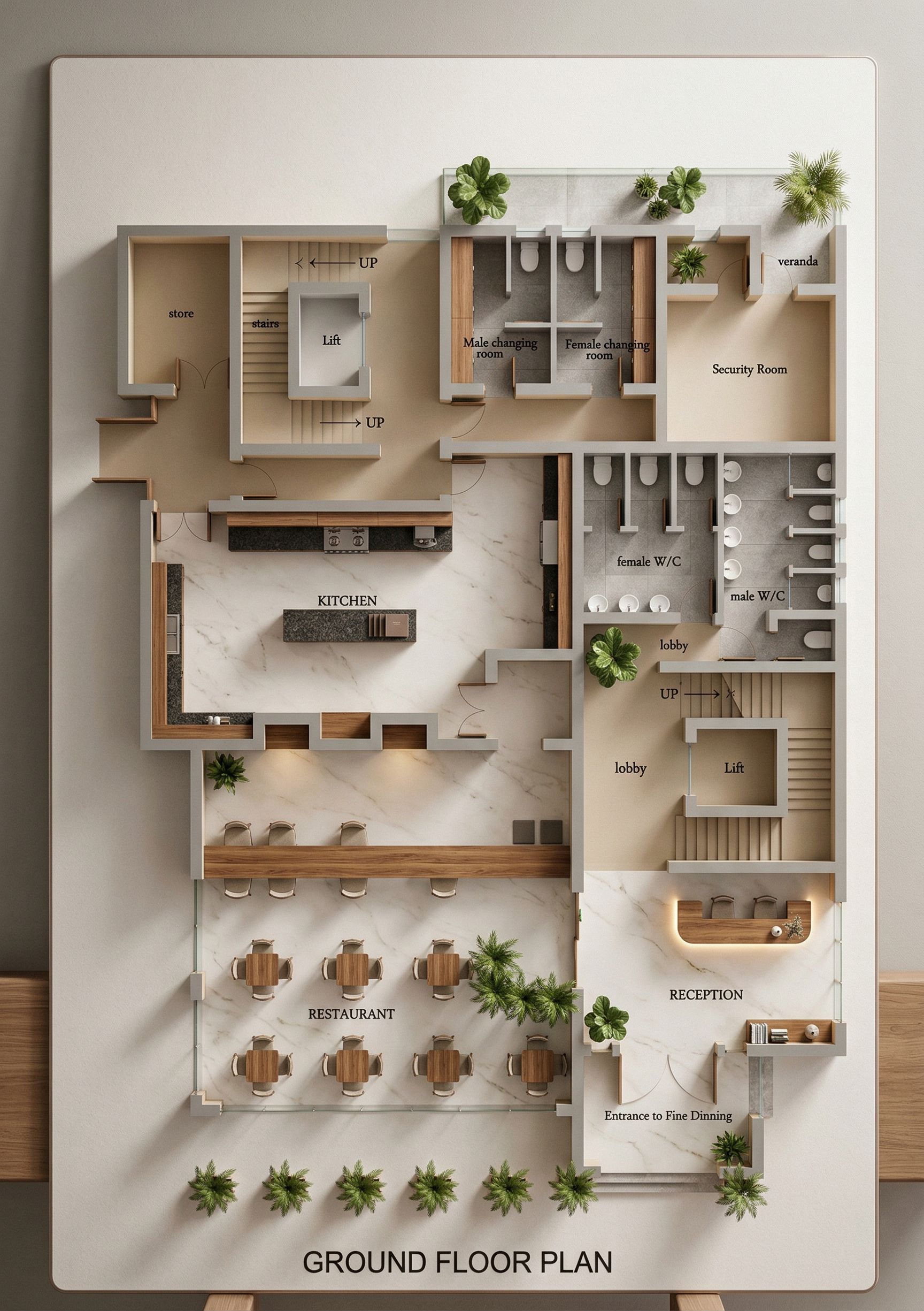 PromptPhotorealistic 2D rendered floor plan, top-down view, based on a luxury restaurant ground floor layout. The layout includes: restaurant dining area, kitchen, reception, male and female W/C, male and female changing rooms, security room, store, staircase, lift, lobby, and veranda — all clearly labeled. The restaurant area is spacious and clean, with a modern furniture layout: evenly spaced dining tables and chairs arranged mainly toward the lower half of the space. No tables or chairs directly in front of the kitchen counter (keep this area open for circulation and service flow). No chandelier in the restaurant — use subtle ceiling lighting instead. The kitchen features a central island and back counter with realistic finishes. The reception area includes a curved modern desk with warm lighting. The restrooms and changing rooms include detailed sanitary fittings and partitions. Apply realistic materials and finishes: Marble flooring in restaurant and reception Warm wood textures for furniture and accents Textured tiles in W/C areas Neutral painted walls in beige and soft grey Include accurate architectural elements: wall thickness, door swings, openings, and windows. Add realistic lighting and shadows: soft ambient lighting, natural light effect, subtle shadows under furniture, warm highlights. Style: luxury modern interior, elegant, minimal, clean, premium presentation board. Color palette: beige, white, soft grey, warm wood tones, and natural green plants. Add interior styling elements: indoor plants, subtle decor, clean surfaces. Render should look like a high-end interior design presentation board, ultra-realistic, sharp, high resolution (4K–8K), with depth and clarity., keep exact camera angle