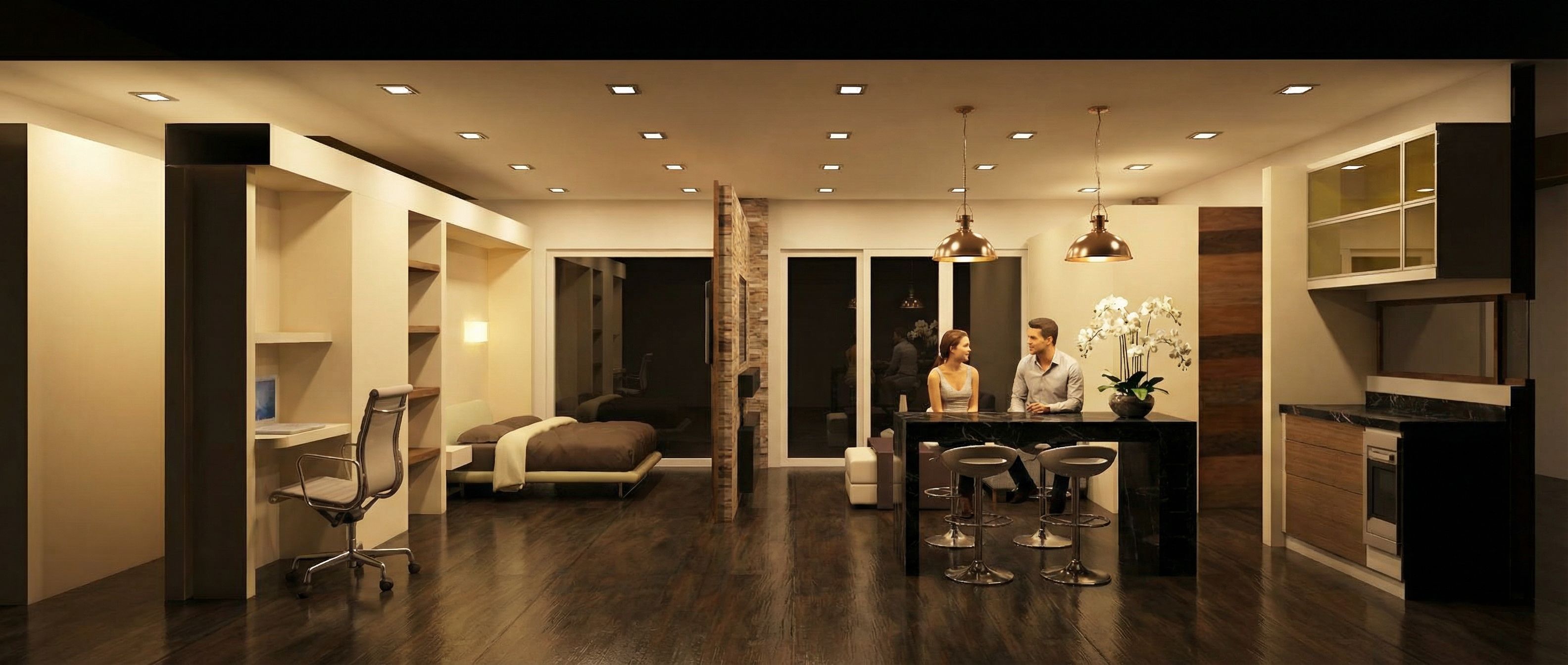 Promptinterior design rendering, render this sketch into technical drawing, COZZY ILUMINATION WITH SQUARE RECESED LAMPS, FLOOR SEMI BRIGHT, KITCHEN ISLAND IN BLACK MARBLE, CHAIRS WITH METAL SHINNY LEGS, YOUNG AND BEAUTIFUL COPPLE SITTING, 2 METAL PENDANT LAMPS OVER ISLAND WITH WARM LIGHT, VASE WITH ORCHIDS, keep exact camera angle, high quality, professional, detailed scene