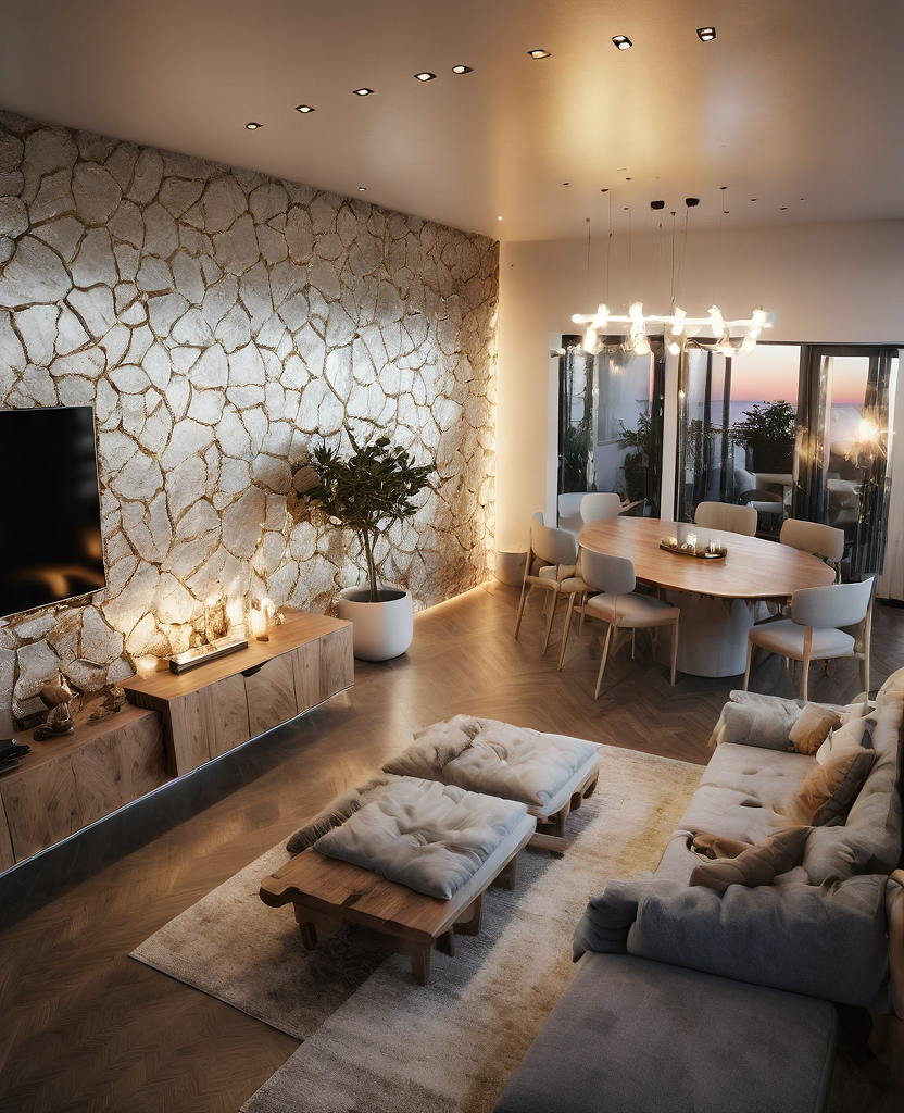 Promptmake a realistic and beautiful picture about a LIVING ROOM of a modern apartment at a SUNSET