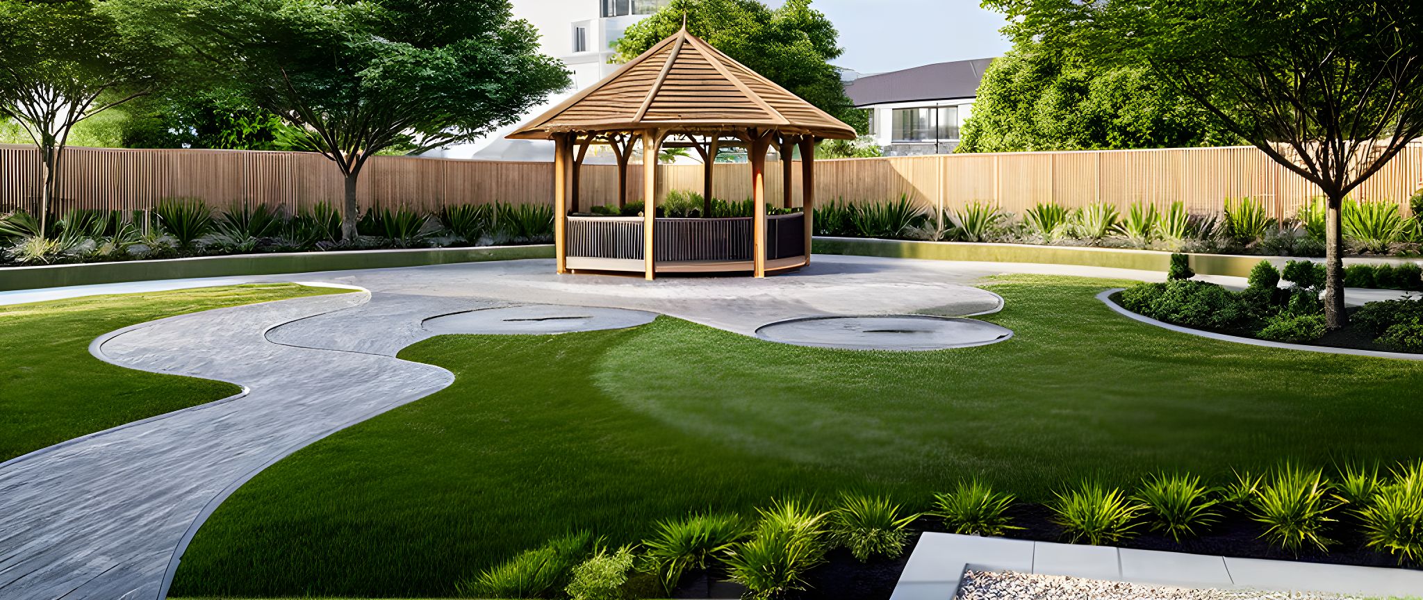 PromptPhoto of a contemporary landscape design featuring a cascading water feature surrounded by lush greenery and modern architectural elements. The building includes a gazebo with a thatched roof, smooth stone pathways, and gently flowing water channels. Urban context includes manicured gardens and flowing contours. Natural daylight illuminates the scene, creating soft reflections on the water's surface. Captured from a high-angle perspective, the framing emphasizes the intricate layout and harmonious integration with nature, using a wide-angle lens to enhance the expansive view.