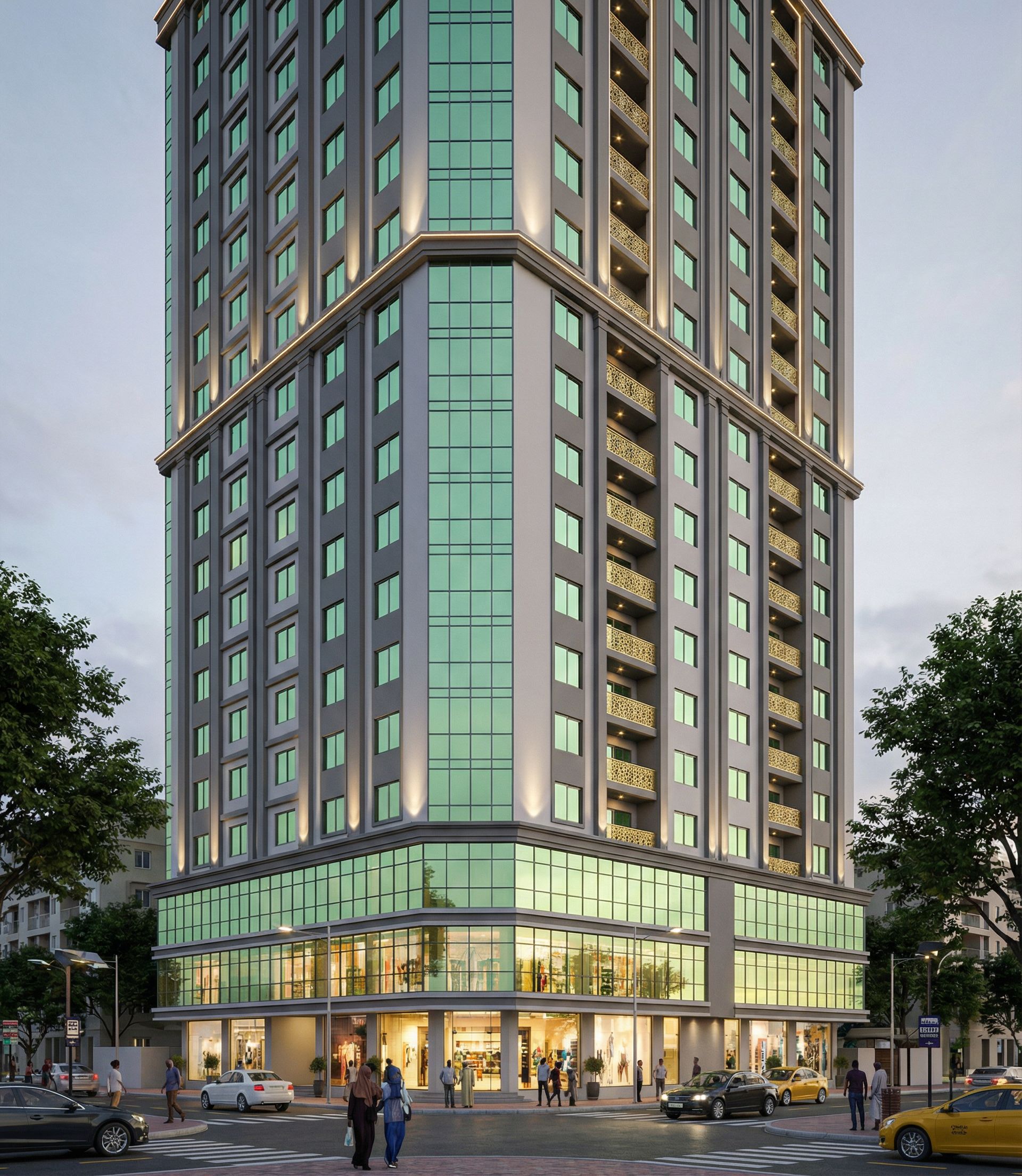 Make a render of an apartment building of 20 stories with ground floor, first floor and second floor commercial and third to twentieth floors apartments. Make glass light green, reflective and realistic. Turn on the lights in the building.Include people of African and Somali origin in the image. Use some spot lights, rope lights and street lights on the . Use the combination of colours in the reference image. Make beams, columns and mouldings the darker. Use curtain walling on first and second floors and at the corner of the building slitghtly touching both facades all the way to the top. Use mashrabya indicated on reference image 2 on balconies., keep exact camera angle