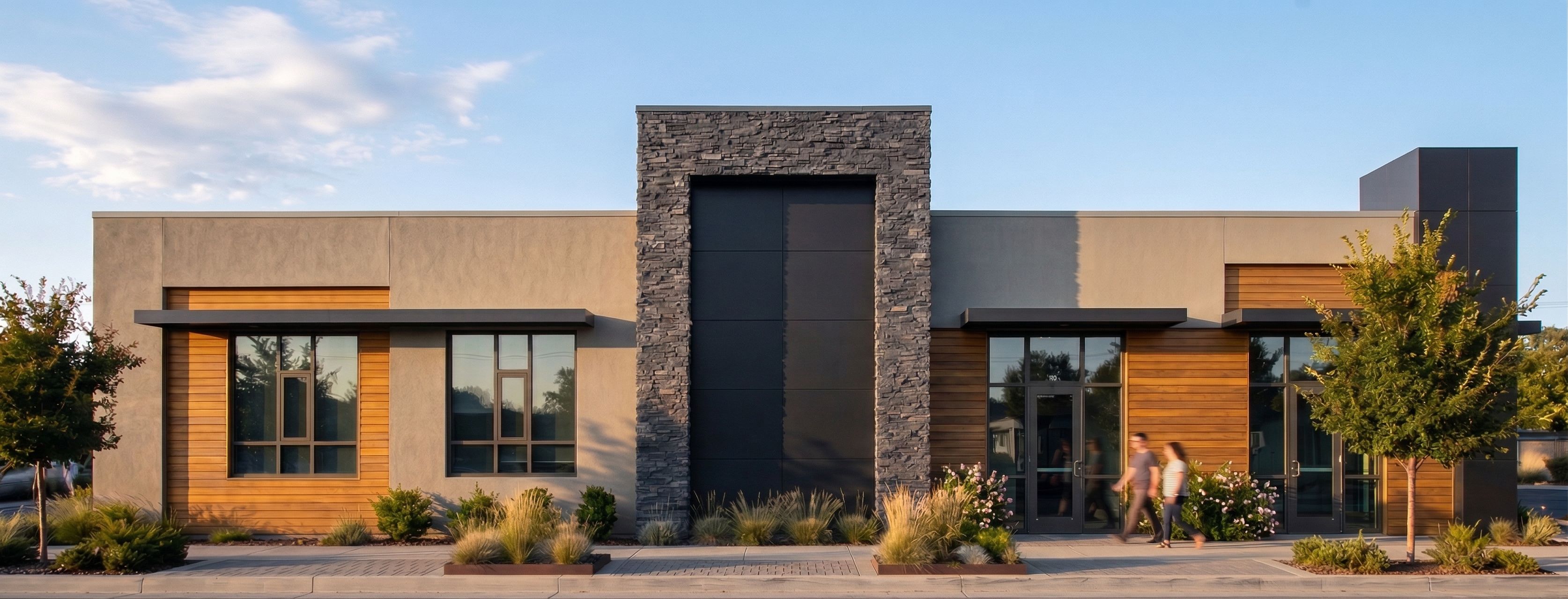 Promptchange metal siding to different material or match stone, keep exact camera angle
