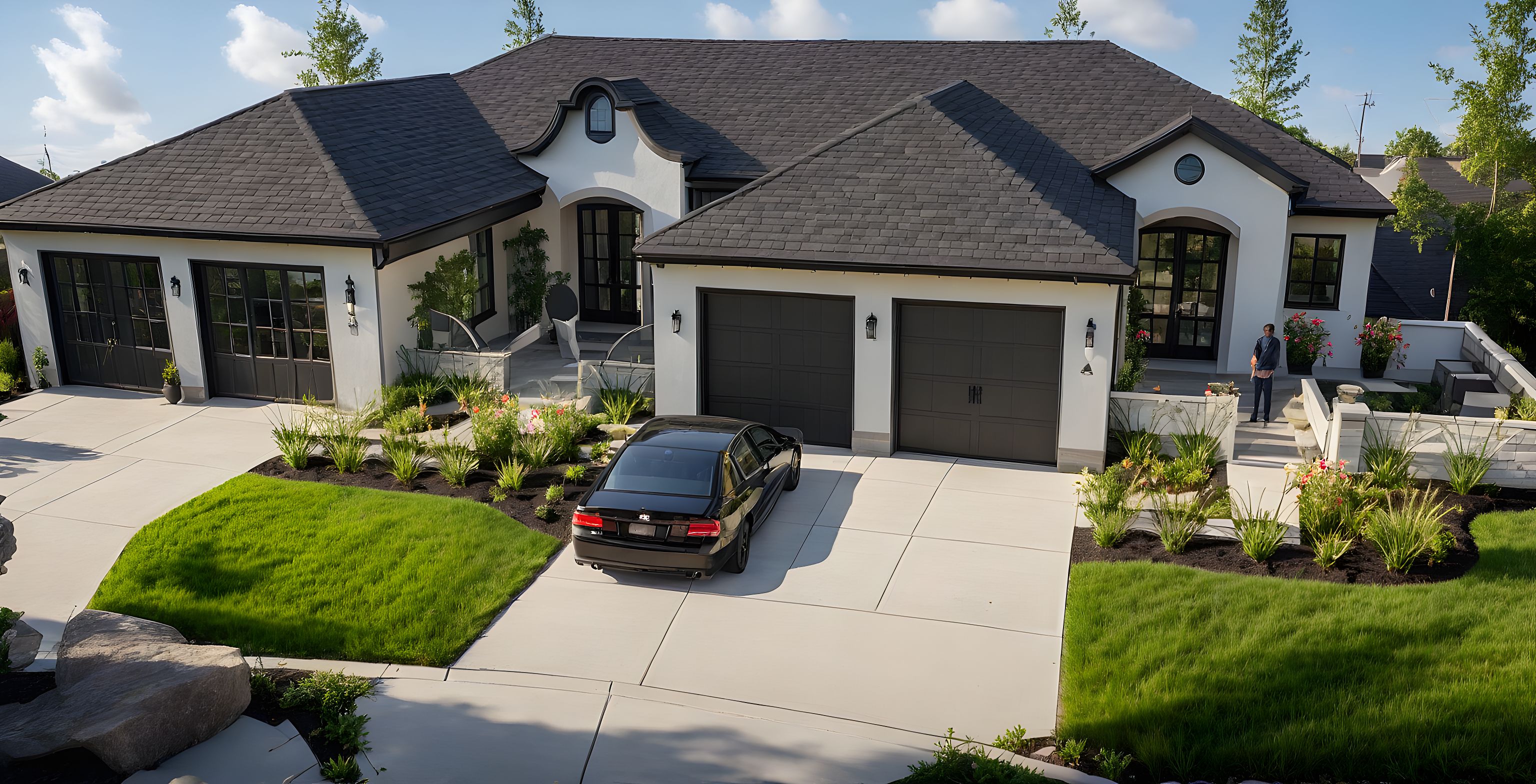PromptPhoto of a modern single-family residence, showcasing elegant design elements including a distinctive roofline, charming double garage doors, and tasteful landscaping with vibrant flowers. The urban setting features a suburban neighborhood backdrop with lush greenery and a serene atmosphere. Soft afternoon sunlight casts gentle shadows, highlighting architectural details. Captured from a slightly elevated angle, the lens emphasizes the inviting front porch and front yard, offering a welcoming view of the home.