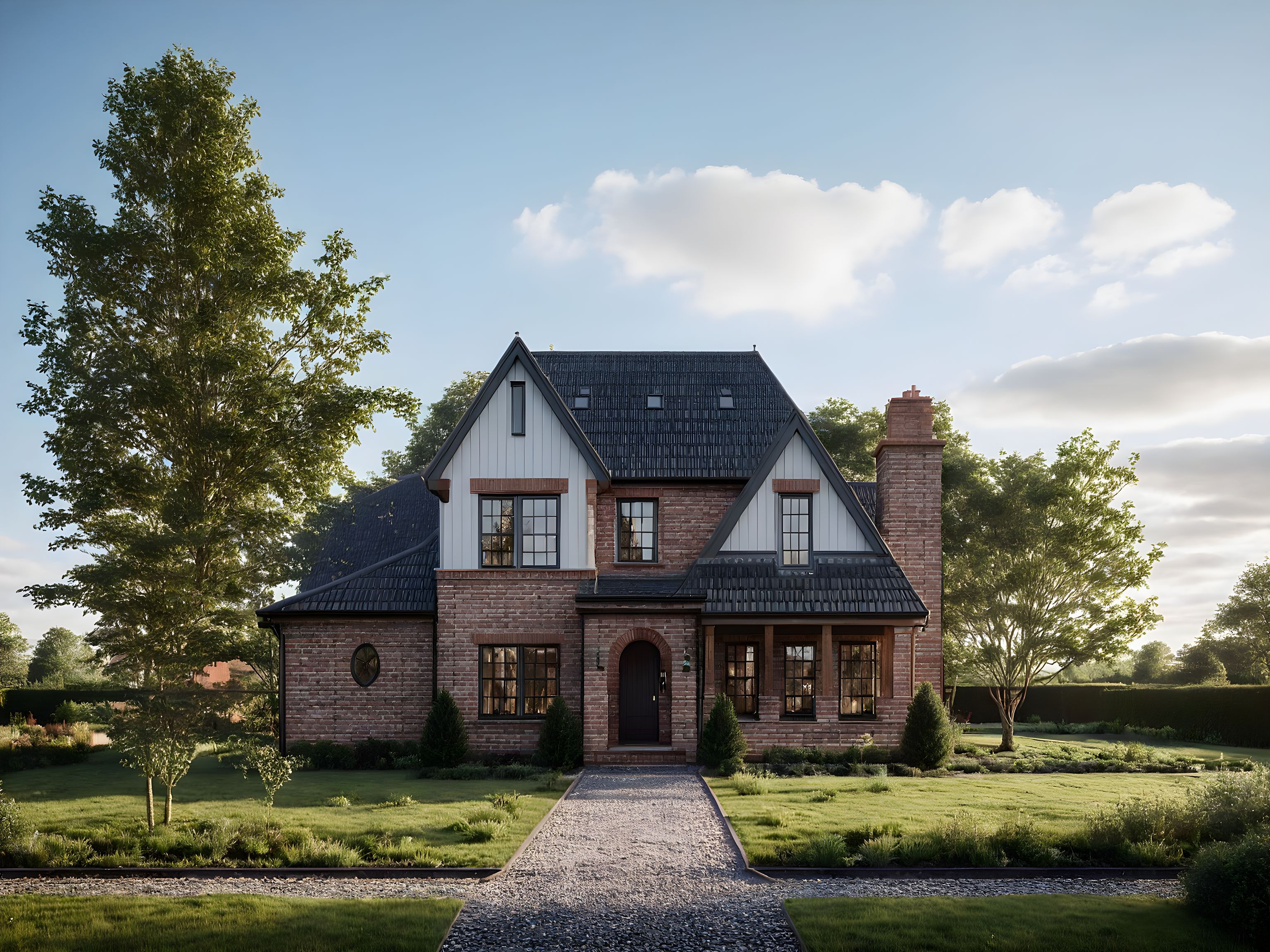 PromptRender this English Cottage style home with natural materials. And natural lighting. Brick facade with vertical siding accents. And a large masonry chimney.