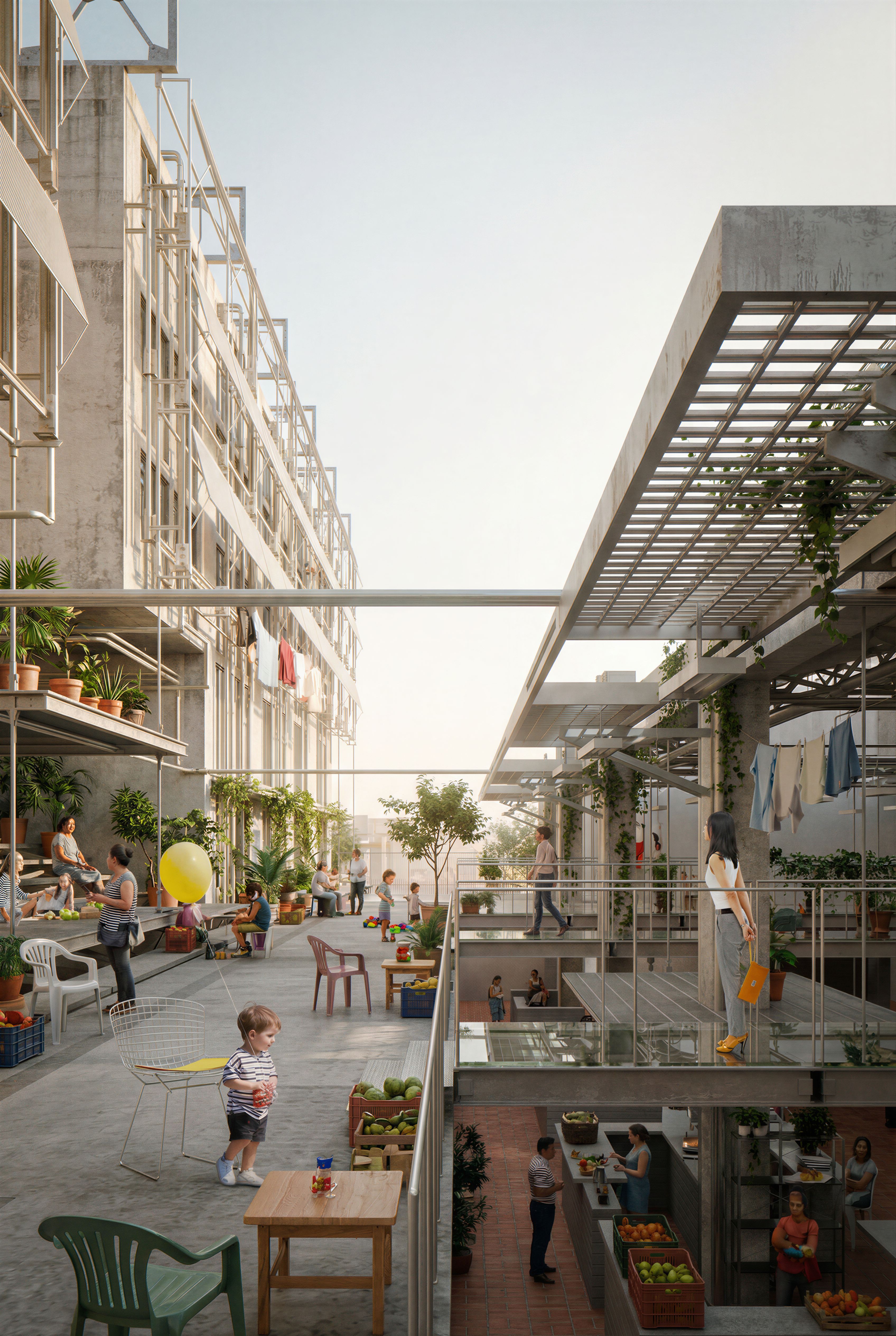 Photorealistic architectural courtyard space within a Mexican affordable housing project. Preserve the architecture, layout, structure, bridges, walkways, stairs, and camera framing exactly as in the reference render. Do not modify the building design or geometry. Enhance realism by adding everyday Mexican life in the shared circulation spaces: residents walking across bridges, neighbors talking, children playing, people carrying groceries, and casual daily activity. Introduce subtle elements such as potted plants, small trees, plastic chairs, laundry hanging from railings, fruit crates, and informal seating. Low contrast and Include warm daylight with soft low contrast lighting. Lively but natural atmosphere, lived-in environment, documentary-style architectural photography., keep exact camera angle