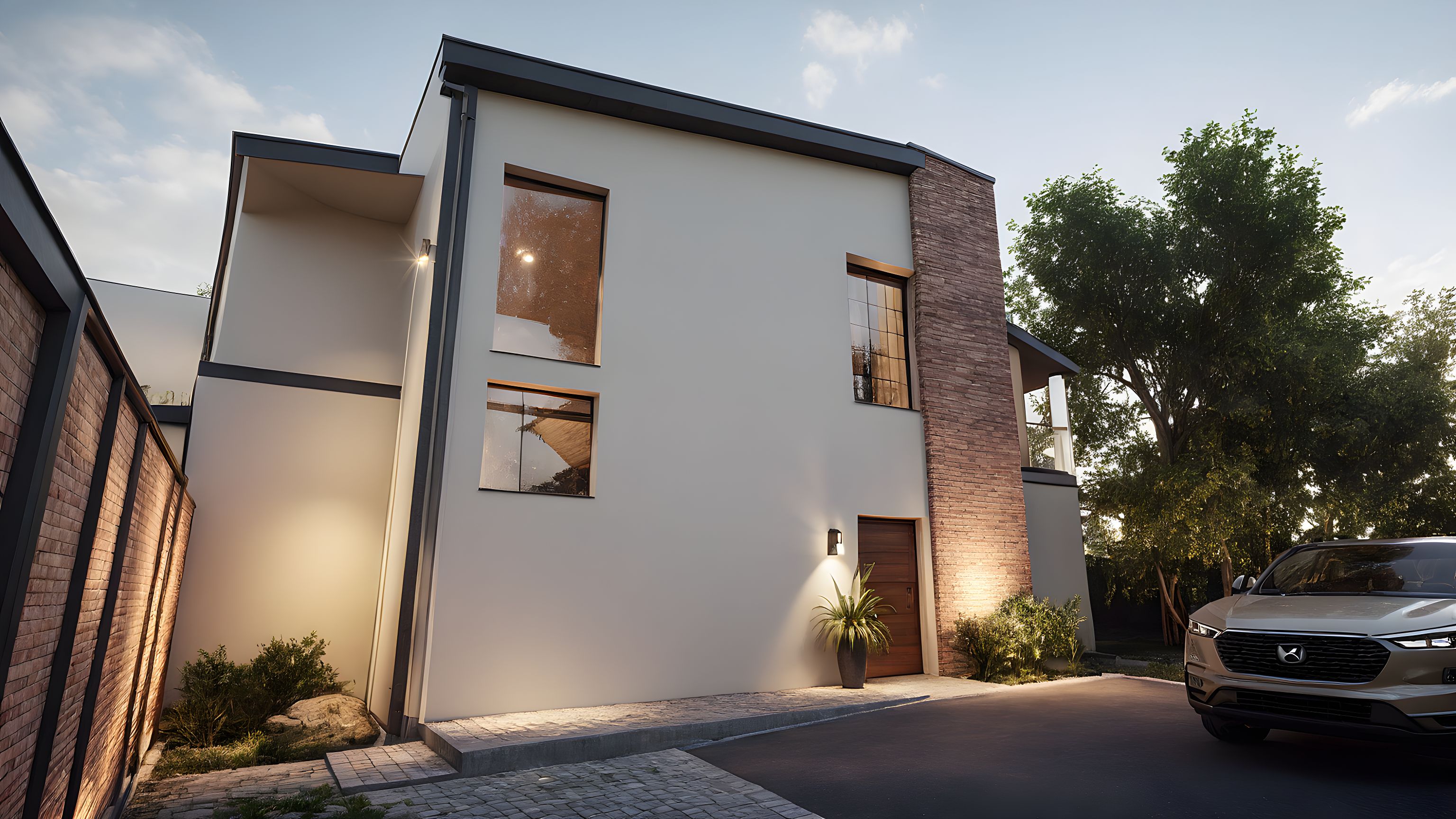 Prompthouse with smooth masonry walls in light beige color. the exposed brick wall is in natural color. the house is modern with a rustic touch. it has a large parking area for two vehicles at the entrance.
