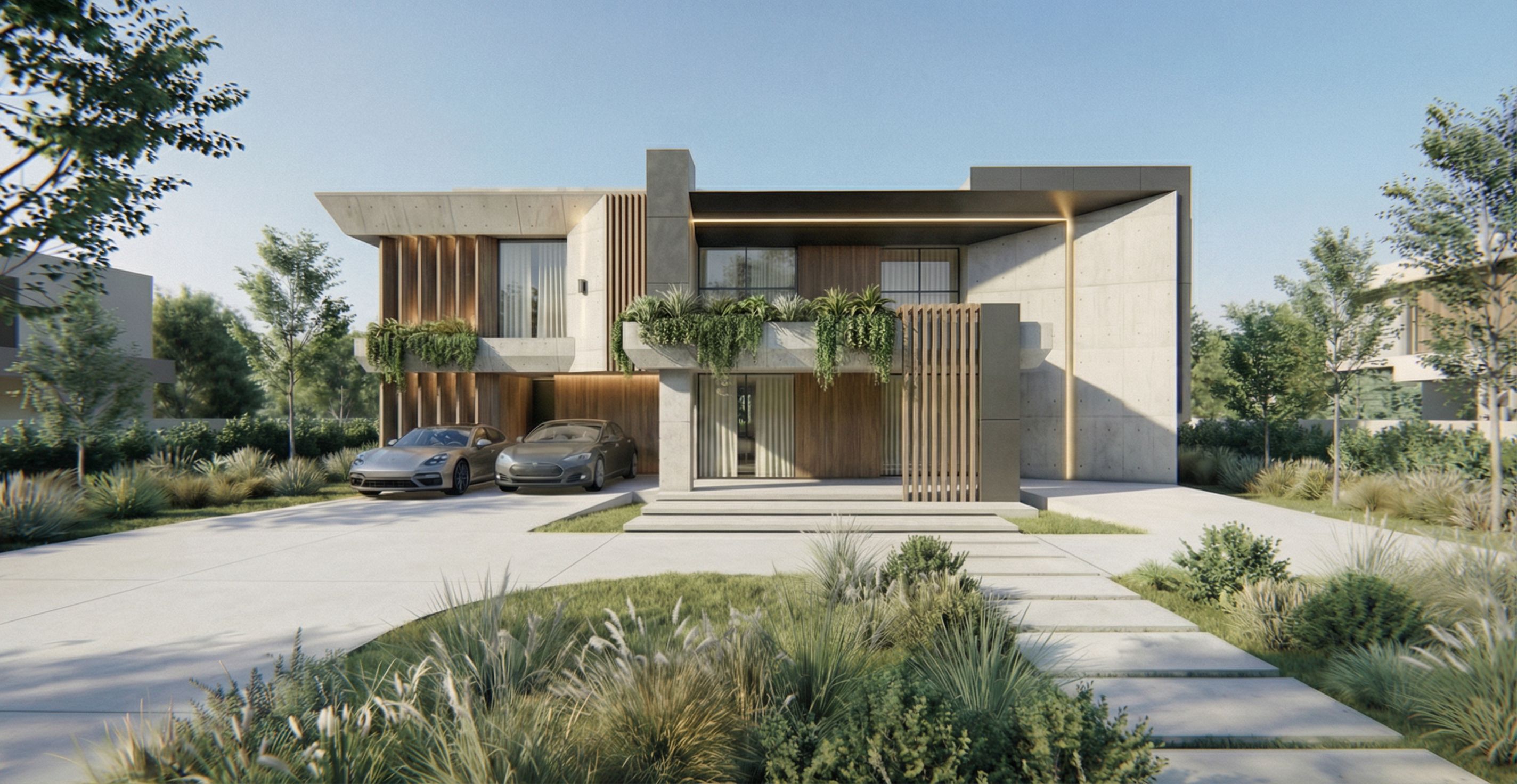 modern minimalist concrete house, two-story contemporary architecture, exposed concrete facade, large cantilevered roof, floor-to-ceiling glass windows with light curtains inside, dark metal accents and vertical wood slats, two modern luxury cars parked in the carport, clean concrete driveway, natural landscaping with ornamental grasses, shrubs and trees surrounding the house, modern pathway with concrete slabs, calm residential environment, in the areas marked with red boxes add hanging plants and facade vegetation integrated into the architecture, bright daylight scene with clear sky, soft natural sunlight with realistic shadows, clean and subtle artificial architectural lighting integrated into the facade and under the roof overhang, minimal and elegant lighting design, architectural photography style, ultra realistic materials, global illumination, highly detailed textures, photorealistic architectural visualization, 8k render, preserve the original architecture of the reference image, maintain the same building shape, proportions and structure, keep exact camera angle