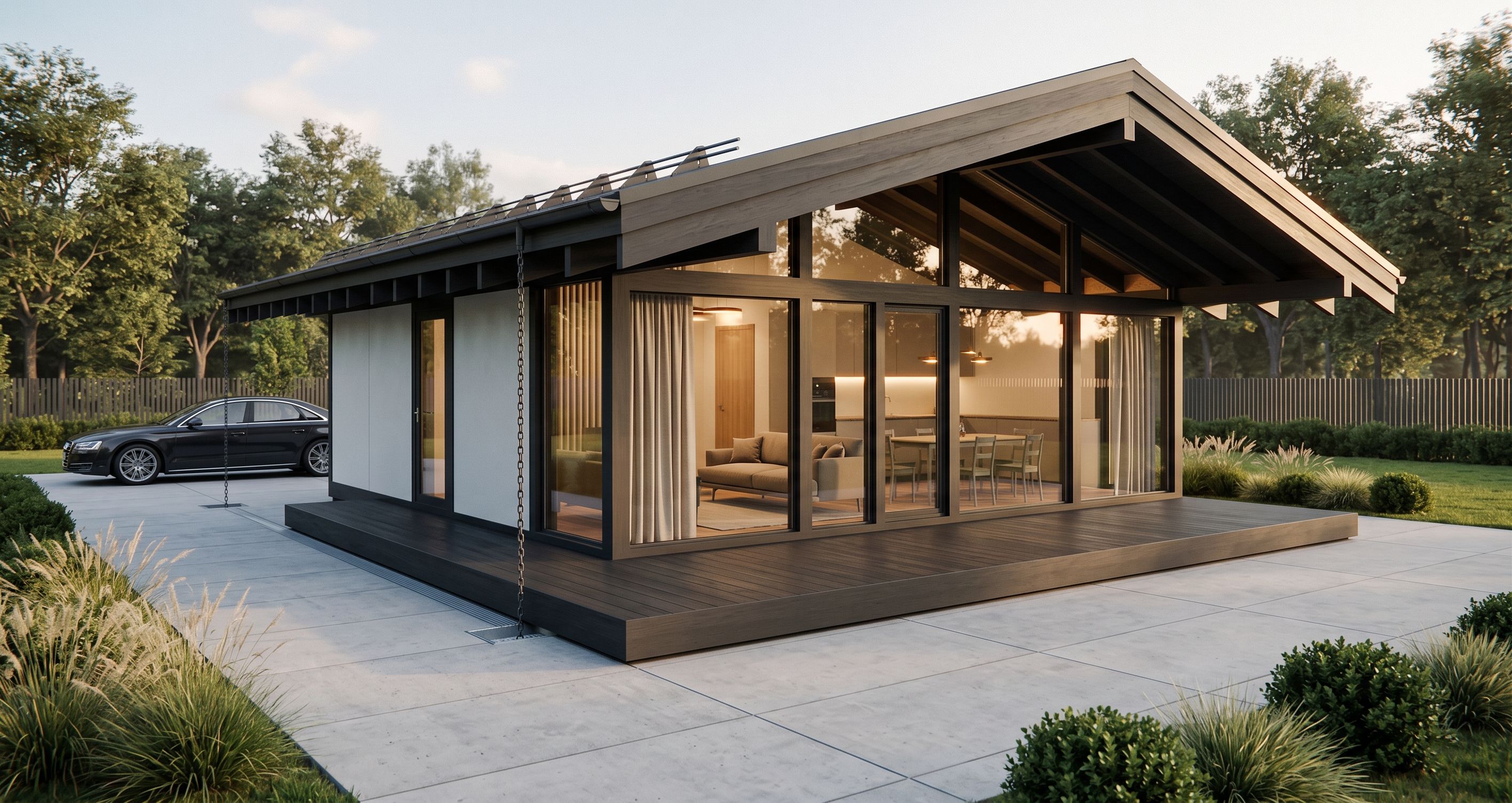 Современный одноэтажный загородный дом в стиле минимализм с элементами скандинавской и японской архитектуры, компактный объём с двускатной крышей и широкими свесами. Конструктивные балки и элементы кровли выполнены в цвете тёмный графит dark graphite wood. Фасад сочетает панорамное остекление в тонких тёмных алюминиевых рамах и светлые гладкие панели. Перед домом устроена терраса из дерева в цвете серый графит, без видимых свай или опор, выглядит как монолитное основание на уровне участка. Терраса плавно переходит в покрытие из крупноформатной бетонной плитки светло-серого цвета с тонкими швами. Слева от дома припаркован современный седан чёрного или тёмно-серого цвета, стоящий строго на плитке. Участок с ухоженным газоном, аккуратные кусты и декоративные злаки у террасы. По периметру — забор и густые лиственные деревья. Цепь водостока аккуратно свисает и уходит в скрытый дренаж в плитке, без камней и декоративных элементов. Через стекло виден интерьер: диван, стол, тёплый свет, лёгкие шторы. Освещение — тёплый мягкий golden hour, длинные тени, реалистичная глобальная иллюминация. , keep exact camera angle