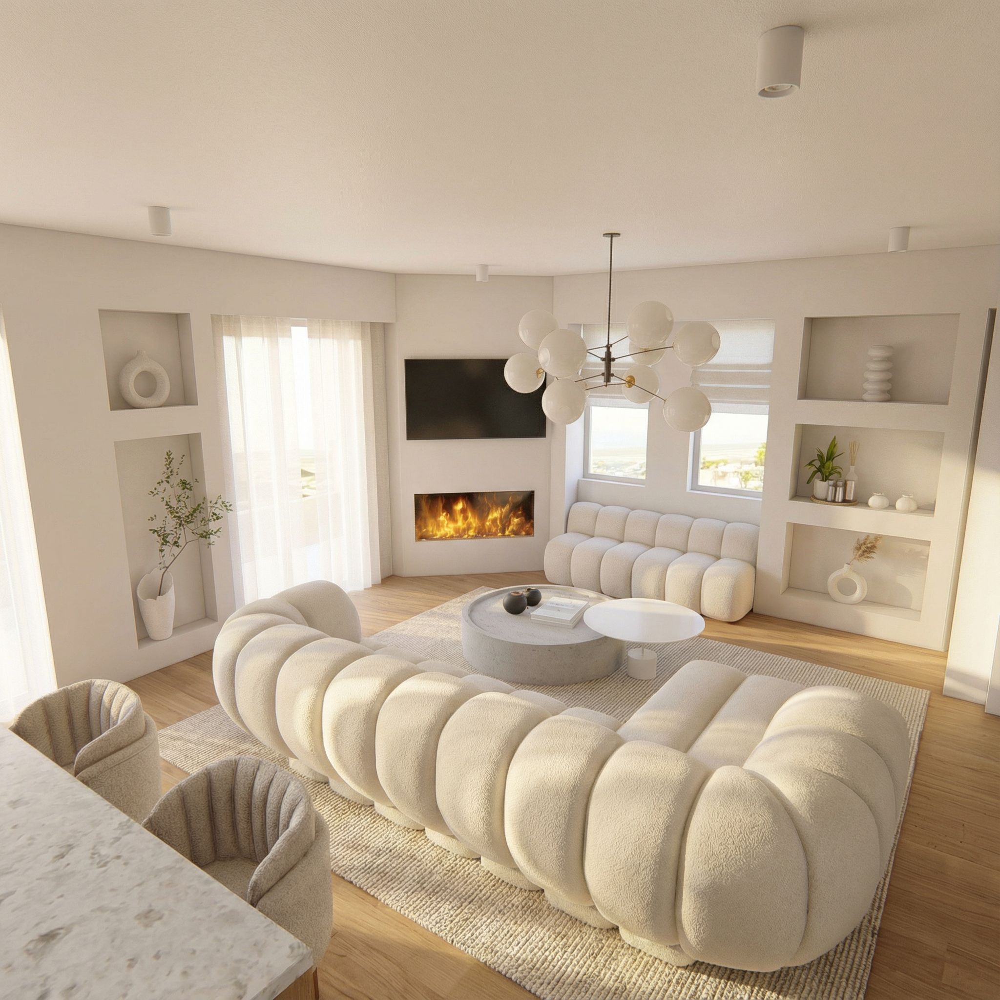interior design rendering, render this 3D mass into photorealistic rendering, elegant style, white and beige tone. monochrome brightness, daylight, same furniture and windows, keep exact camera angle, including furniture, high quality, professional, detailed scene