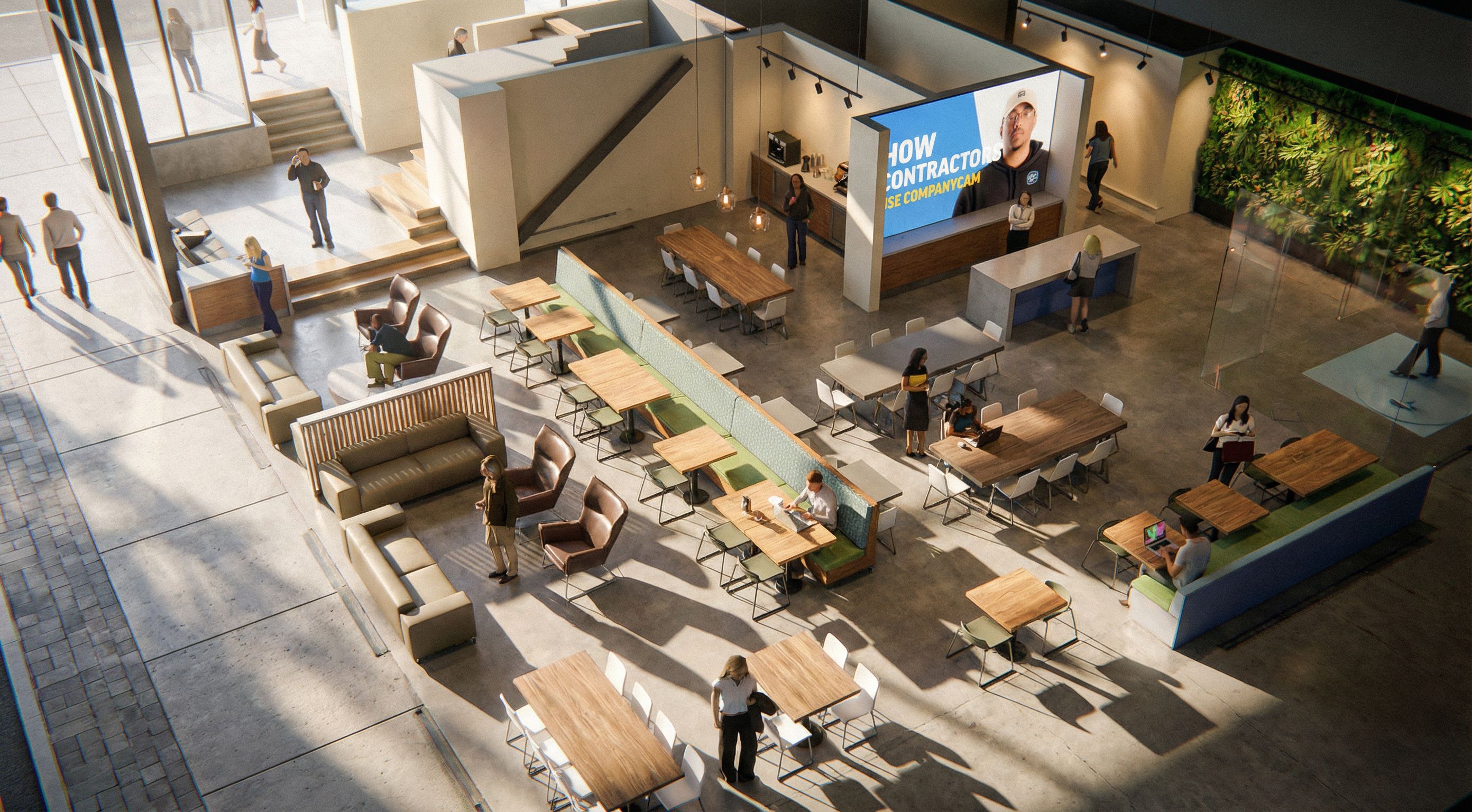 Photo of a modern coffee shop and cafe layout with collaborative spaces. Featuring sleek furniture with a mix of textures, soft seating areas, and a vibrant green wall, the design promotes interaction. Natural light floods the space, creating dynamic shadows. The camera is positioned from above, capturing the intricate arrangement of tables and chairs with a wide-angle lens to enhance depth perception. Additional elements include decorative screens and digital signage, showcasing the blend of functionality and aesthetic appeal in a contemporary urban environment. far left side of rendering in grey is a sidewalk not tables, keep exact camera angle