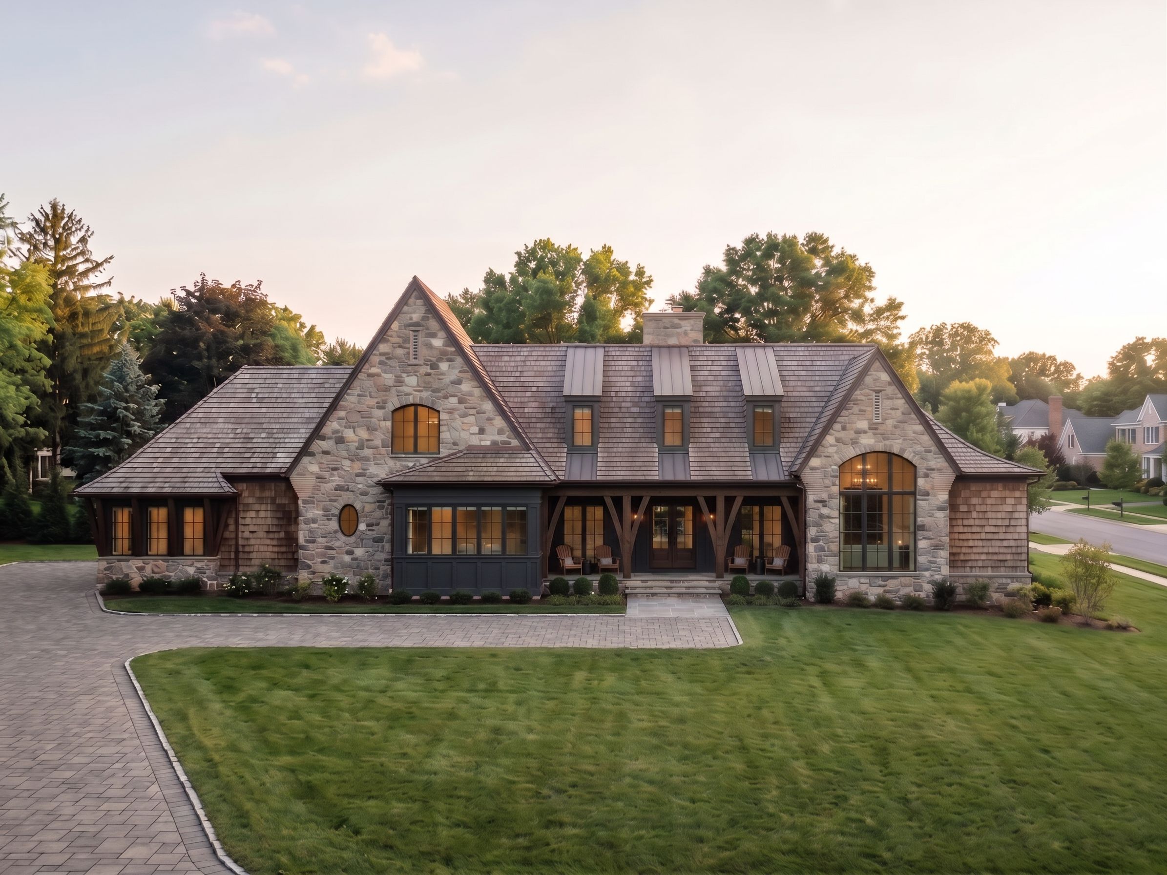 PromptMake these changes: Concrete paver driveway. Dark stained porch wood. Steeper solid angled brackets at porch. Remove ridge cap at front bumpout on right side. Roof should continue naturally over bumpout. , keep exact camera angle