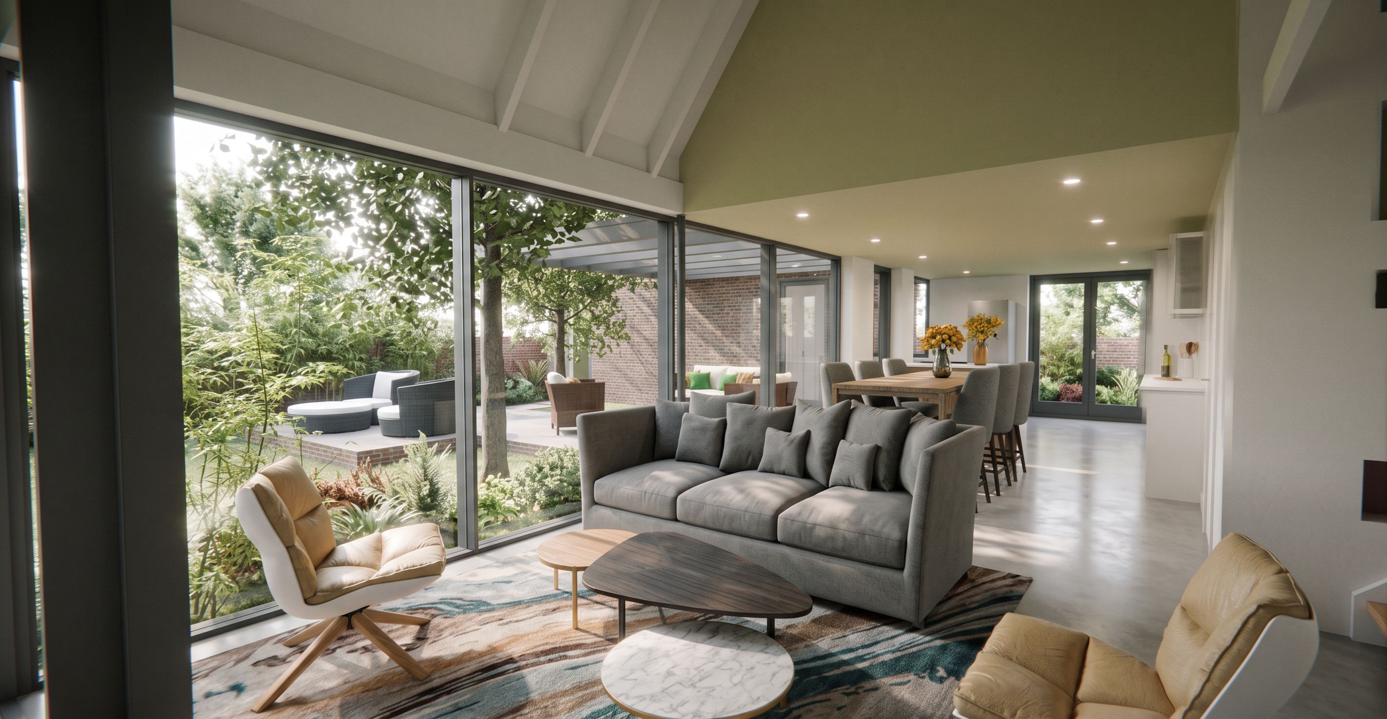 PromptPhoto of a modern living space featuring open-plan architecture with large glass windows. Emphasizing sleek furnishings, organic textures, and neutral color palettes. Surrounded by a landscaped garden with a patio area and outdoor seating. Natural daylight illuminating the room creates soft shadows, enhancing the cozy atmosphere. Captured from a low angle with a wide-angle lens, showcasing the depth of the space and inviting outdoor views. gladde lichtgrijze vloer, keep exact camera angle