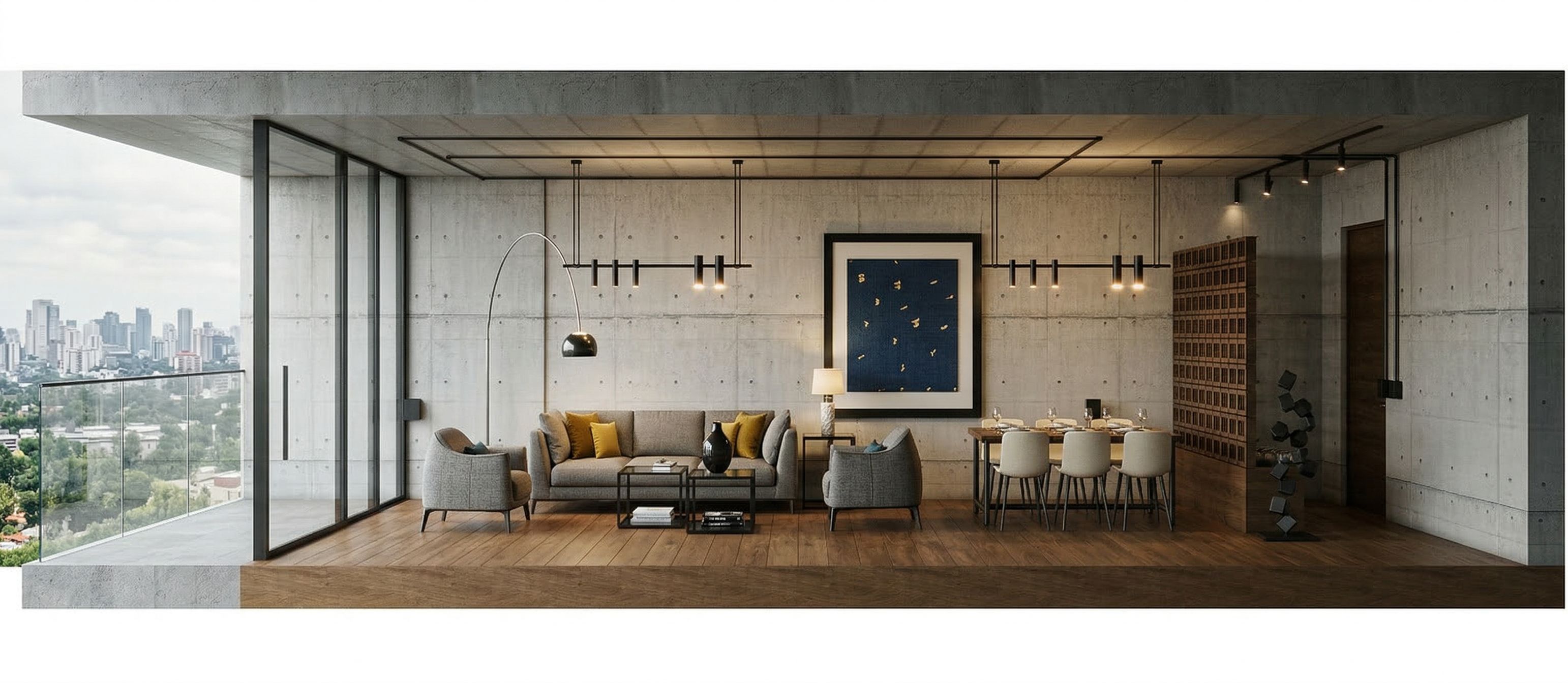 APARTAMENTO INDUSTRIAL ELEGANTE, SUELO MADERA MEDIO, MOBILIARIO ELEGANTE CARO, pared hormigon visto , COLORES NATURALES, ARTISTICO, no cambies la perspectiva, no interpretes, no modifiques la volumietria, keep exact camera angle