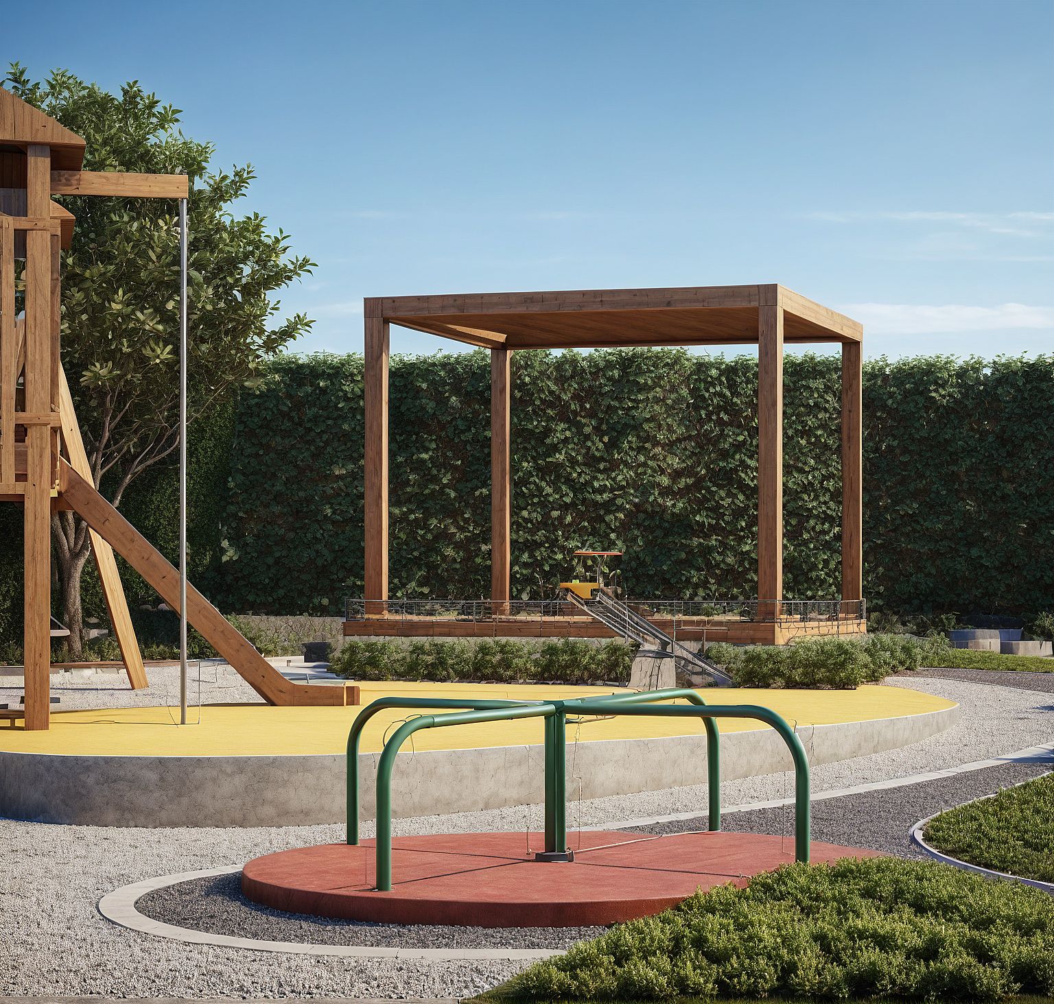 An incredibly lifelike, richly detailed, photorealistic architectural photograph of a kids playground. Keep the structural, geometry, textures, colors and architectural design of the image