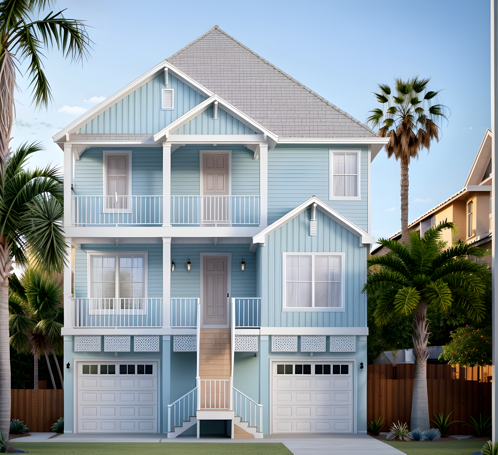 PromptNew construction plan, three story. Exterior paint is light blue. Coastal community on a large lot. All trim, handrails, and ballasts are white. palm trees in the yard.