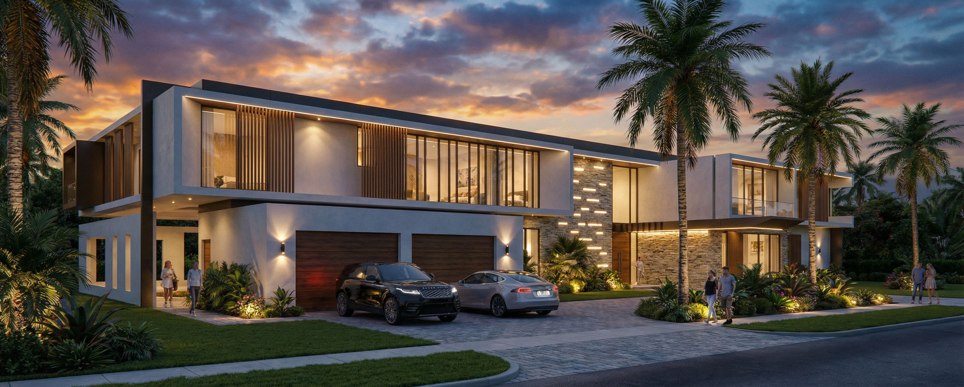 PromptCIELO MAS REALISTA. LUMINARIAS MODERNAS BIEN DISTRIBUIDAS EN LAS FACHADAS. ILUMINACION INTERNA TENUE, keep exact camera angle