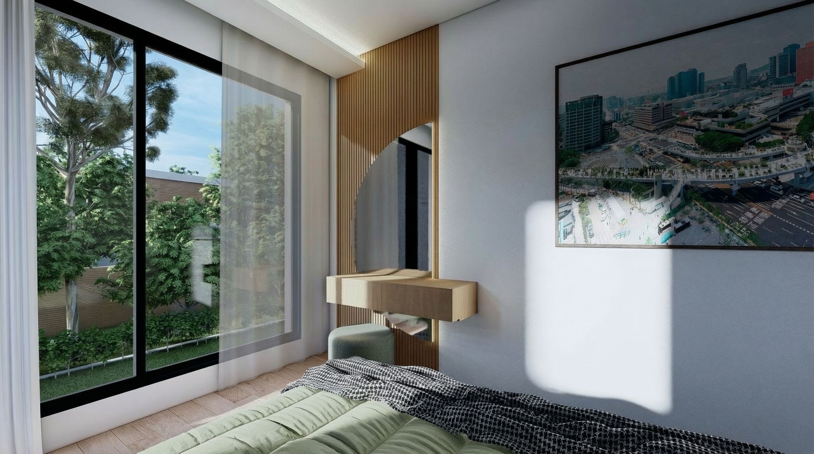 interior design rendering, render this photo into photorealistic rendering, “Enhance this interior render of a modern villa while preserving ALL original materials, textures, colors, finishes, furniture, lighting fixtures, layout, geometry, and proportions exactly as they are. Do NOT alter or replace any material or object.