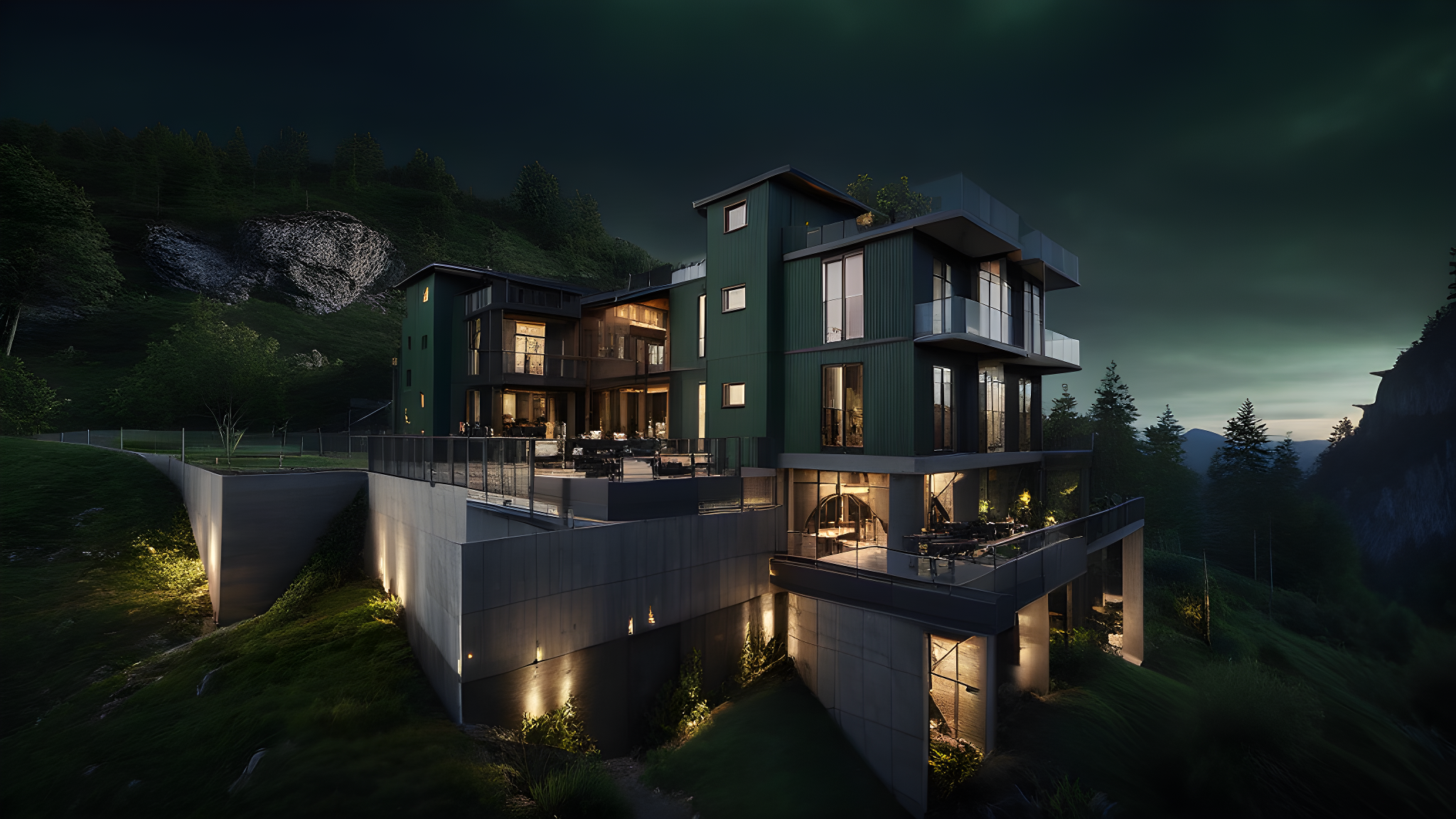 landscape ,mountains ,dark green walls ,grey walls